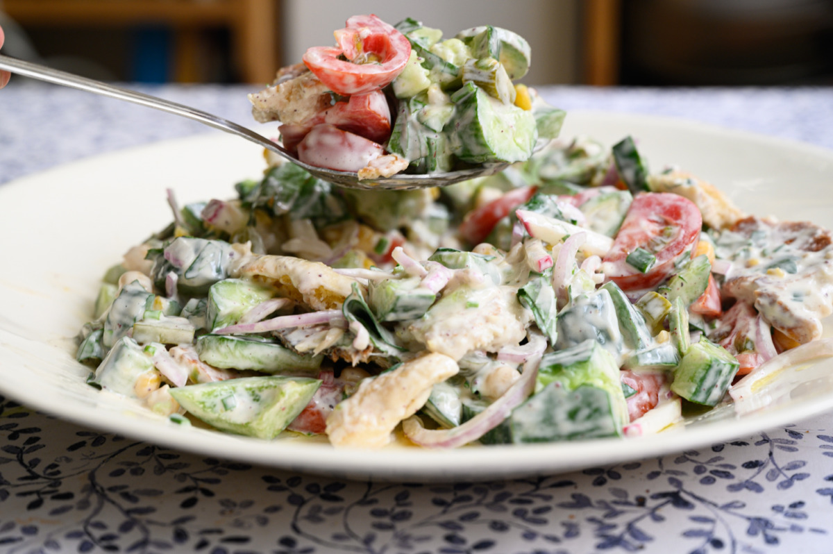 נערבב את כל הירקות יחד, נקרע את הפיתה ניצוק את הרוטב ונערבב טוב טוב ונזלול. בד”כ אני מסיימת את זה לבד. אבל זה לגמרי מנה ל2-4 אנשים.