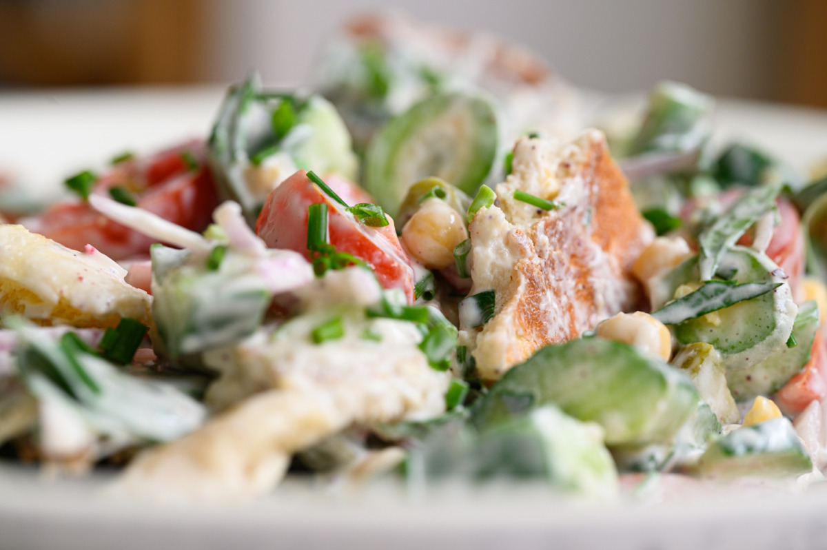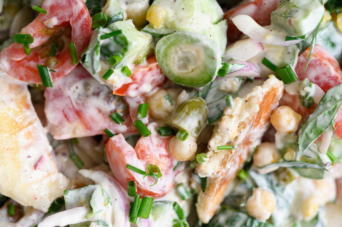 מה שחשוב בסלט הזה זה הטחיניו (טחינה עם יוגורט שום ולימון) וטריות הירקות. הירקות שחייבים להיות בסלט הם: מלפפונים ירוקים טריים מלפפונים חמוצים, עגבניות ובצל סגול, כל השאר זה בהתאם לעונה ולכוונה.
