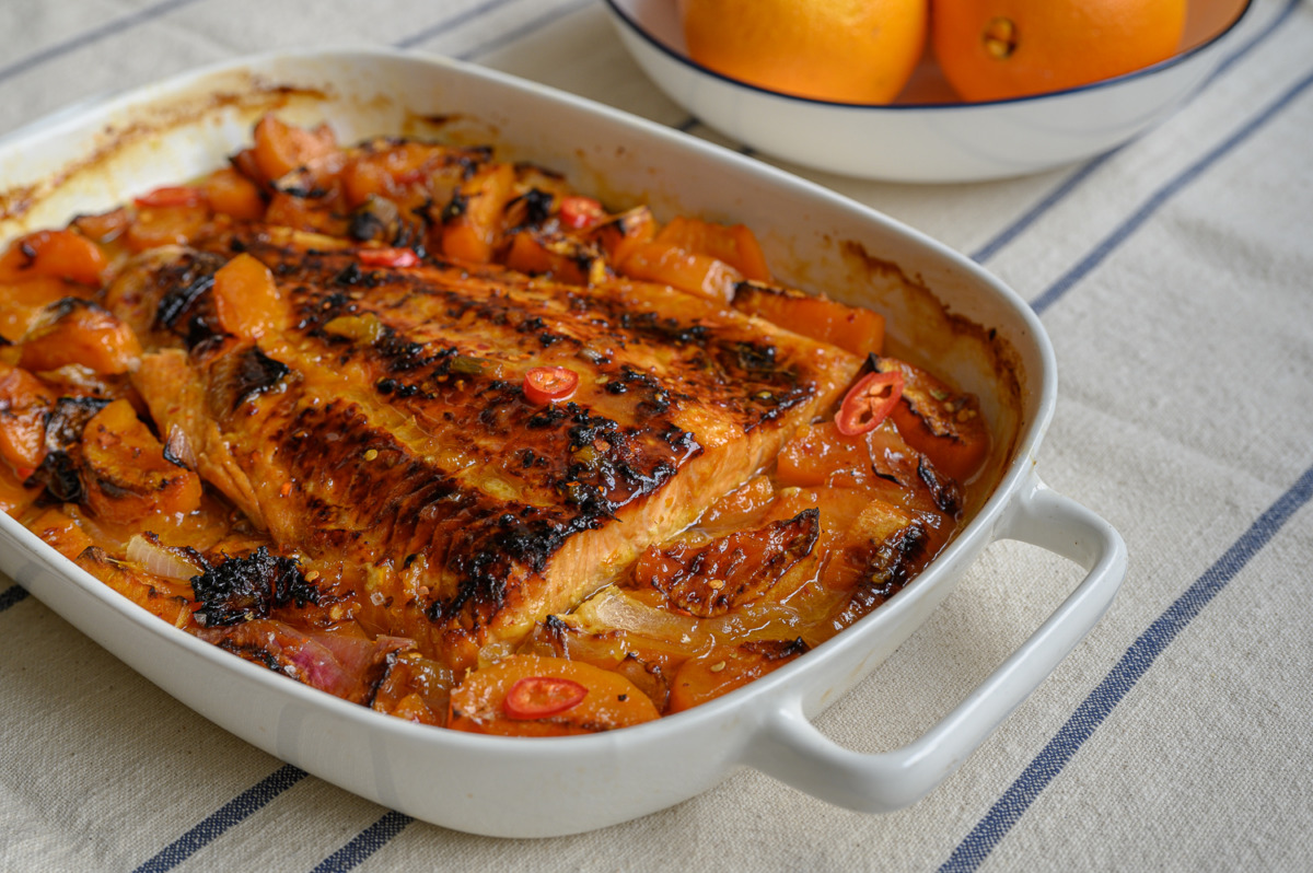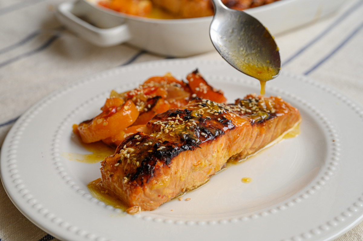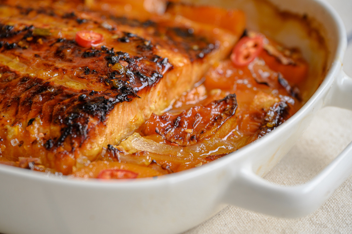 5. אחרי 35 דקות, נוציא ונשקה עם כף את הסלמון והבטטות ברוטב. נעביר התנור למצב גריל 200 מעלות לצריבה יפה בת -10 דק עד רבע שעה. מושלם. מי שרוצה בהגשה יעטר בשומשום קלוי וטבעות דקיקות של צ’ילי טרי.