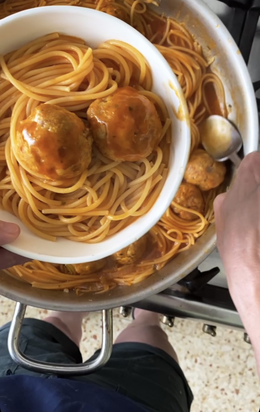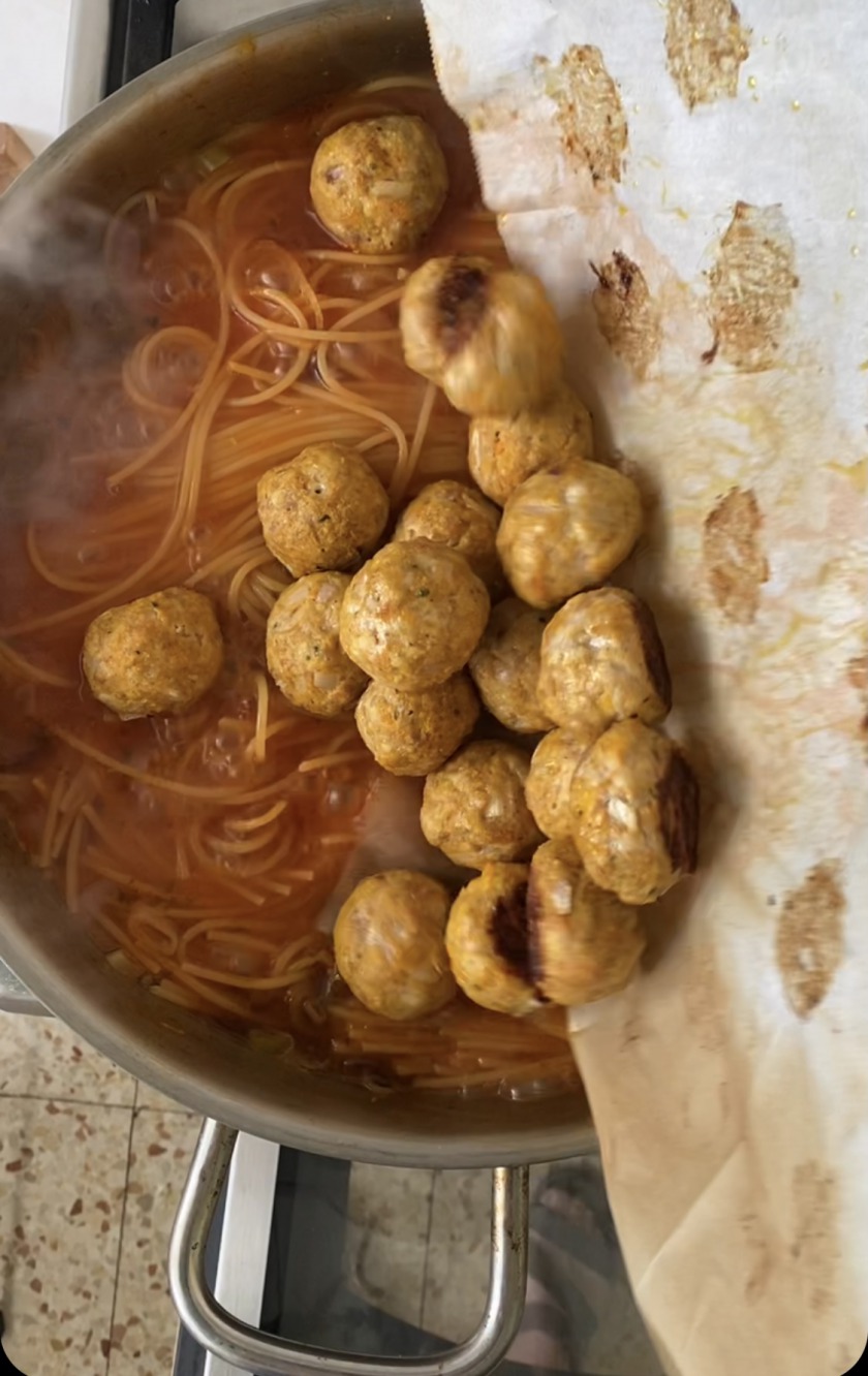6. נגליץ’ את הקציציות שלנו מדף האפייה ישר לסיר, נשקשק מעט את הסיר, נסדר יפה בין הספגטי, נכסה סיר אש קטנה עוד רבע שעה. מוכן!!