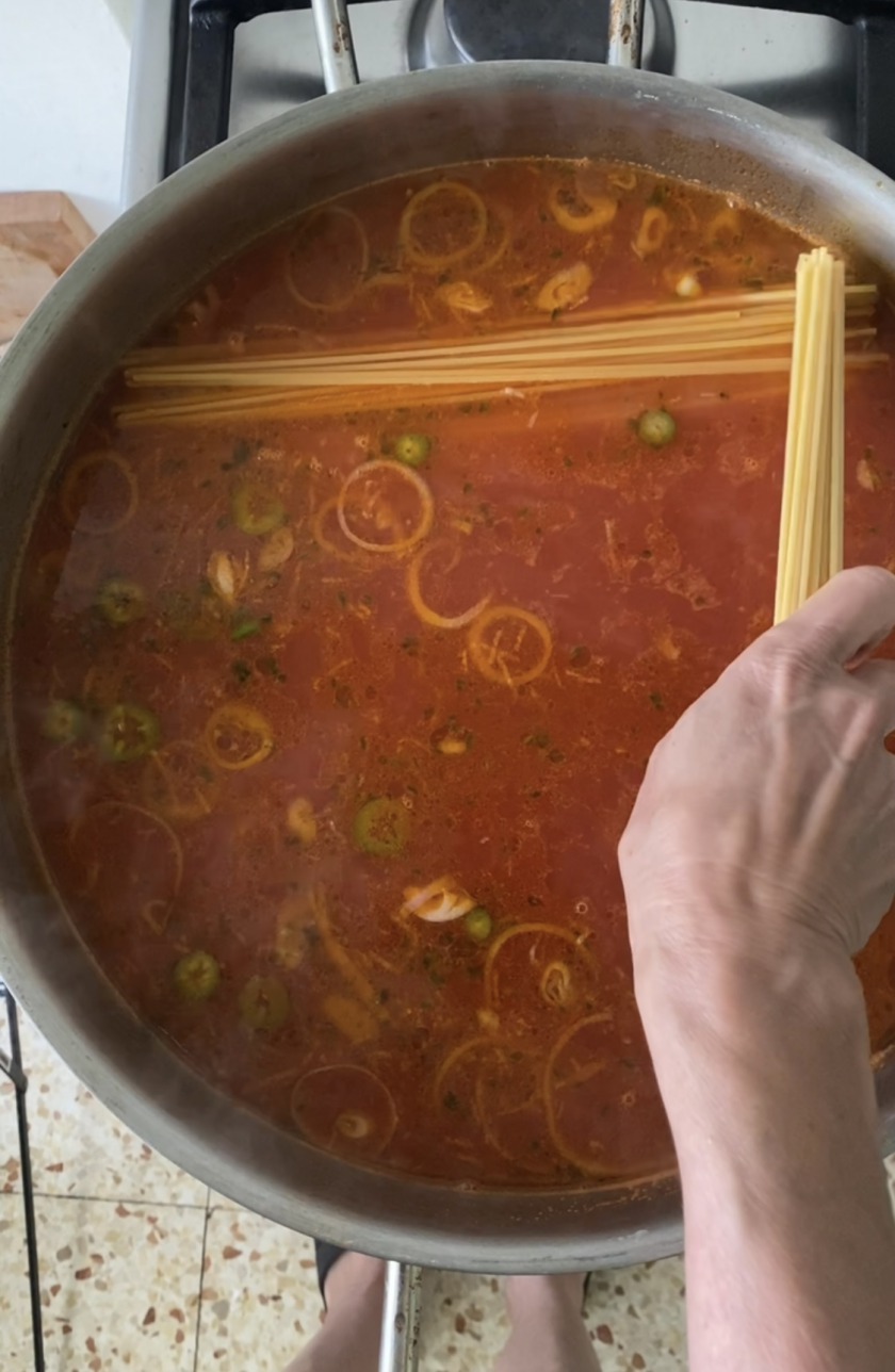 5. בסיר רחב נטגן בצל קצוץ, נוסיף את רוטב הסיר עם 4-6 כוסות מים רותחים (נטעם אחרי הוספת המים אם חסר מלח, נוסיף) כשיש בעבוע, נוסיף ספגטי, נכסה סיר אש קטנה כ-15 דקות