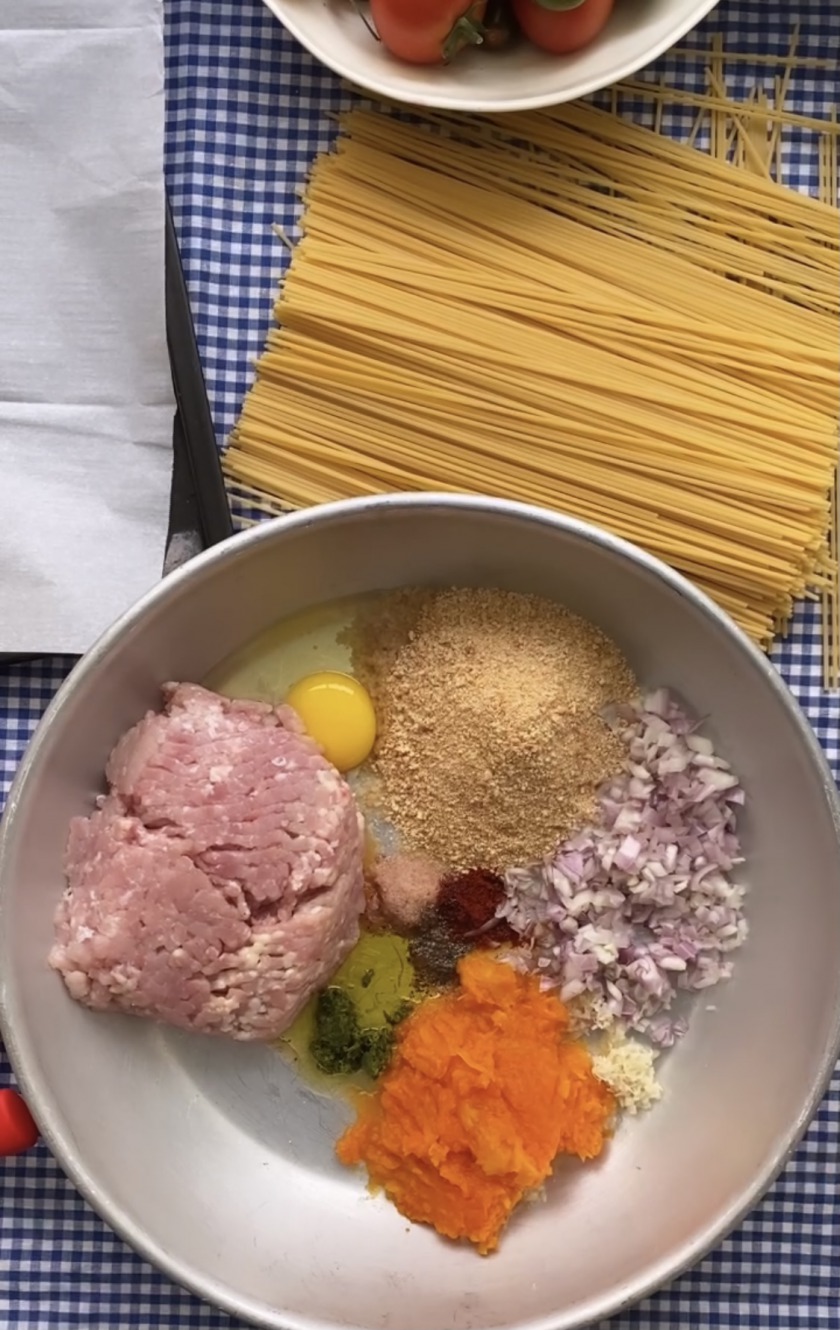 3. נכניס לקערה: בשר טחון, בצל, עשבי תיבול, קטשופ, ביצה,פירה דלעת, פירורי לחם, שן שום כתושה, כף שמן זית נלוש את התערובת היטב נוסיף כפית מלח ונמשיך ללוש עד הטמעה.