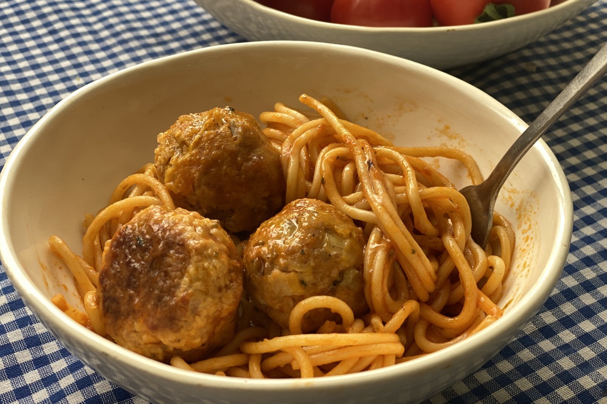 6. נגליץ’ את הקציציות שלנו מדף האפייה ישר לסיר, נשקשק מעט את הסיר, נסדר יפה בין הספגטי, נכסה סיר אש קטנה עוד רבע שעה. מוכן!!