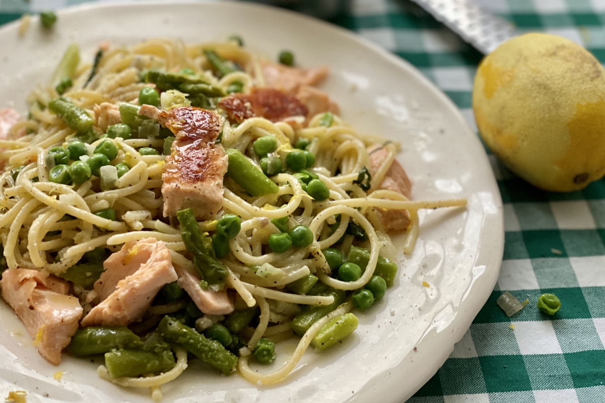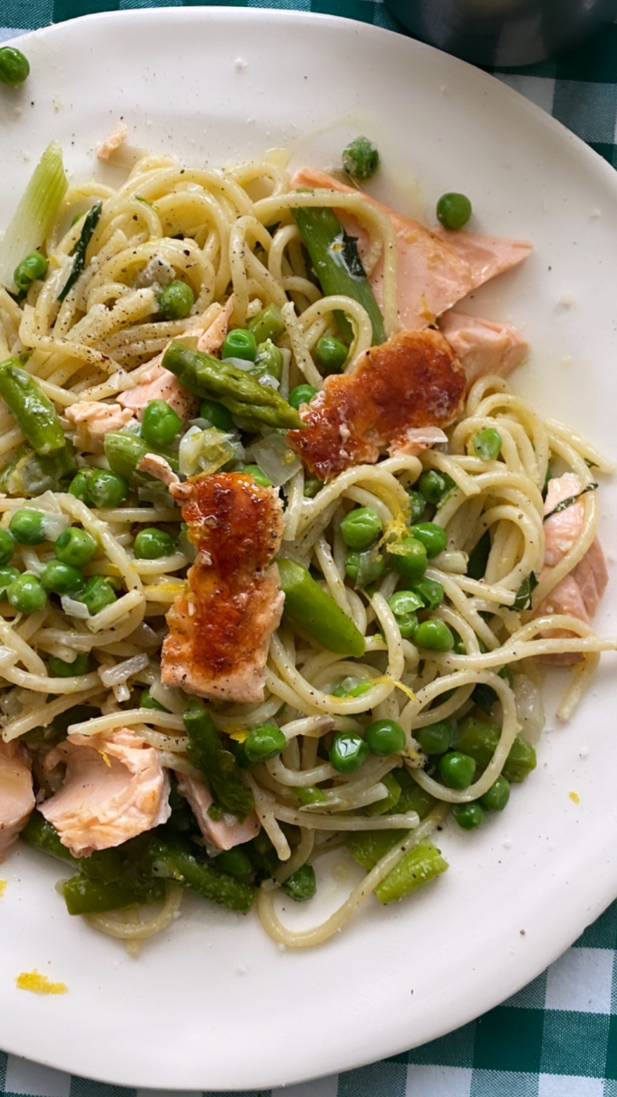 5. המפגש – את הספגטי שסיננו נוסיף לסיר הירוקים, נוסיף אספרגוס, עוד 3 כפות שמנת מתוקה ומעט חמאה, נערבב היטב, נוסיף בצל ירוק, עוד גרידת לימון, נפדר בפרמז’ן ועוד מעט שמן זית ופלפל שחור נפרק נתחי סלמון על הספגטי. נגיש מיד.