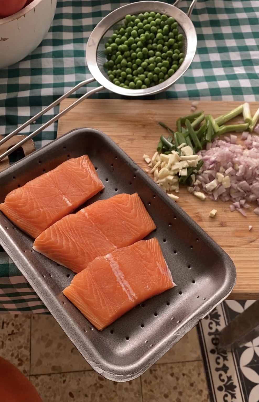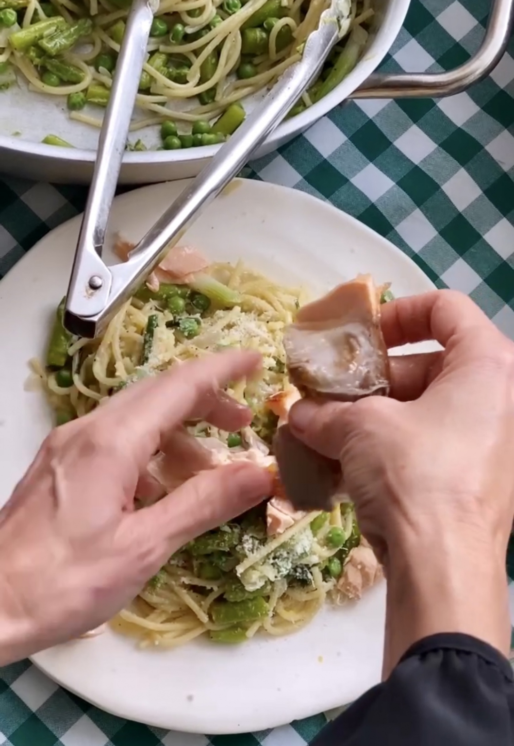 אני אוהבת שכל דבר מקבל את היחס שלו בסיר אחר ואז מתחבר! הסלמון נצרב יפה על מחבת, הספגטי מתבשל בסיר עם שפע מים מומלחים והירקות מתאדים בחמאה ושמן זית