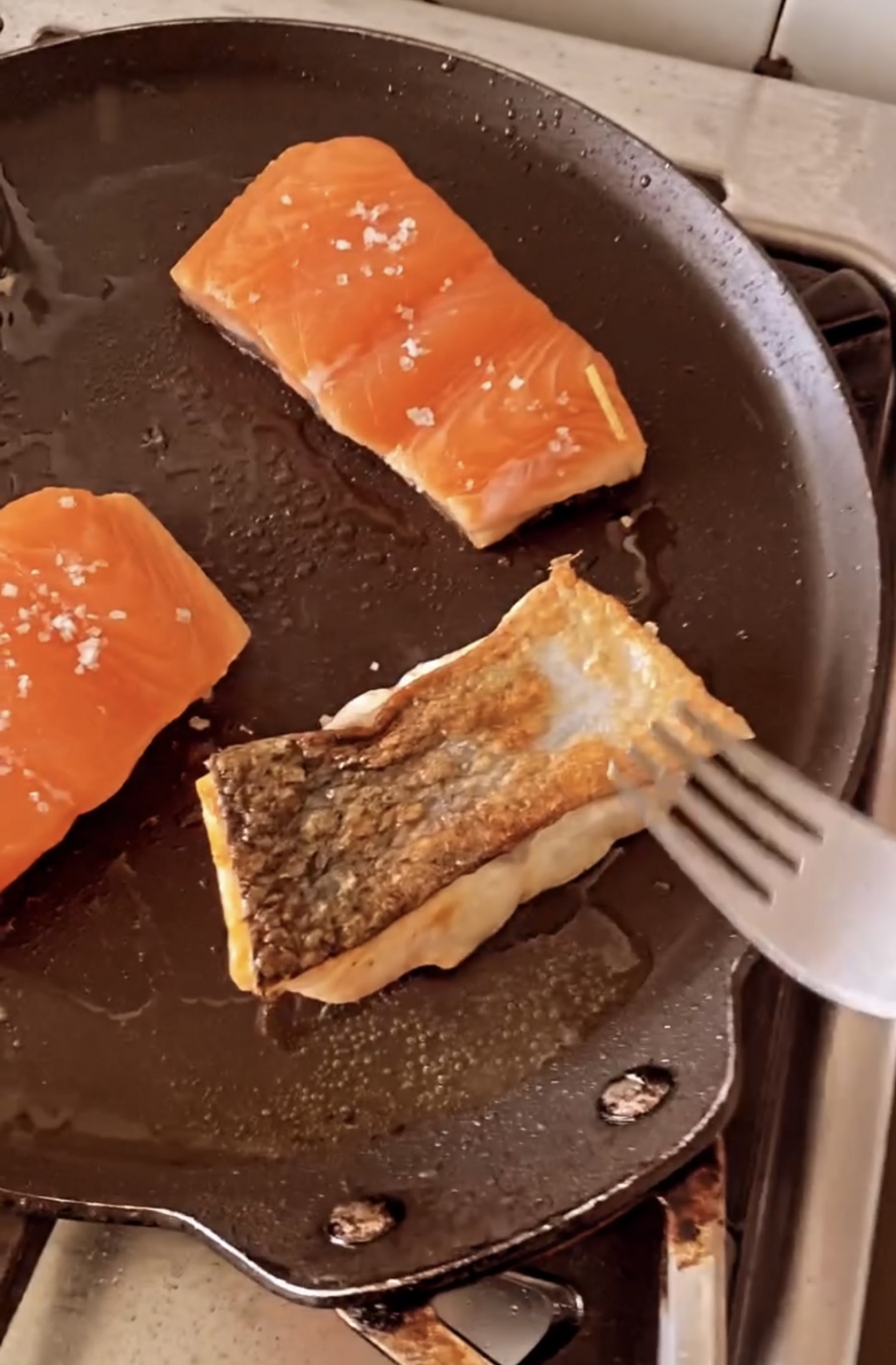 4. הסלמון – נמליח ונפלפל הנתחים – על אש כיריים בינונית עם 2 כפות שמן זית נניח את נתחי הסלמון רק כשהמחבת ממש חמה על החלק עם העור, עד השחמה יפה של העור, רק אז נהפוך צד, זה ניתק לבד ולא נדבק לא לזרז את הסלמון, הוא יודע מתי לקפוץ ולהינתק מבסיס המחבת. צד א’ כ-5 דק’ מלאות צד ב’ כ-3 דק’. אנחנו רוצים שהסלמון יהפוך מכתום זורח לכתום בהיר בהיר, רק ונימוח