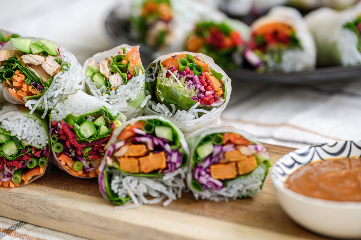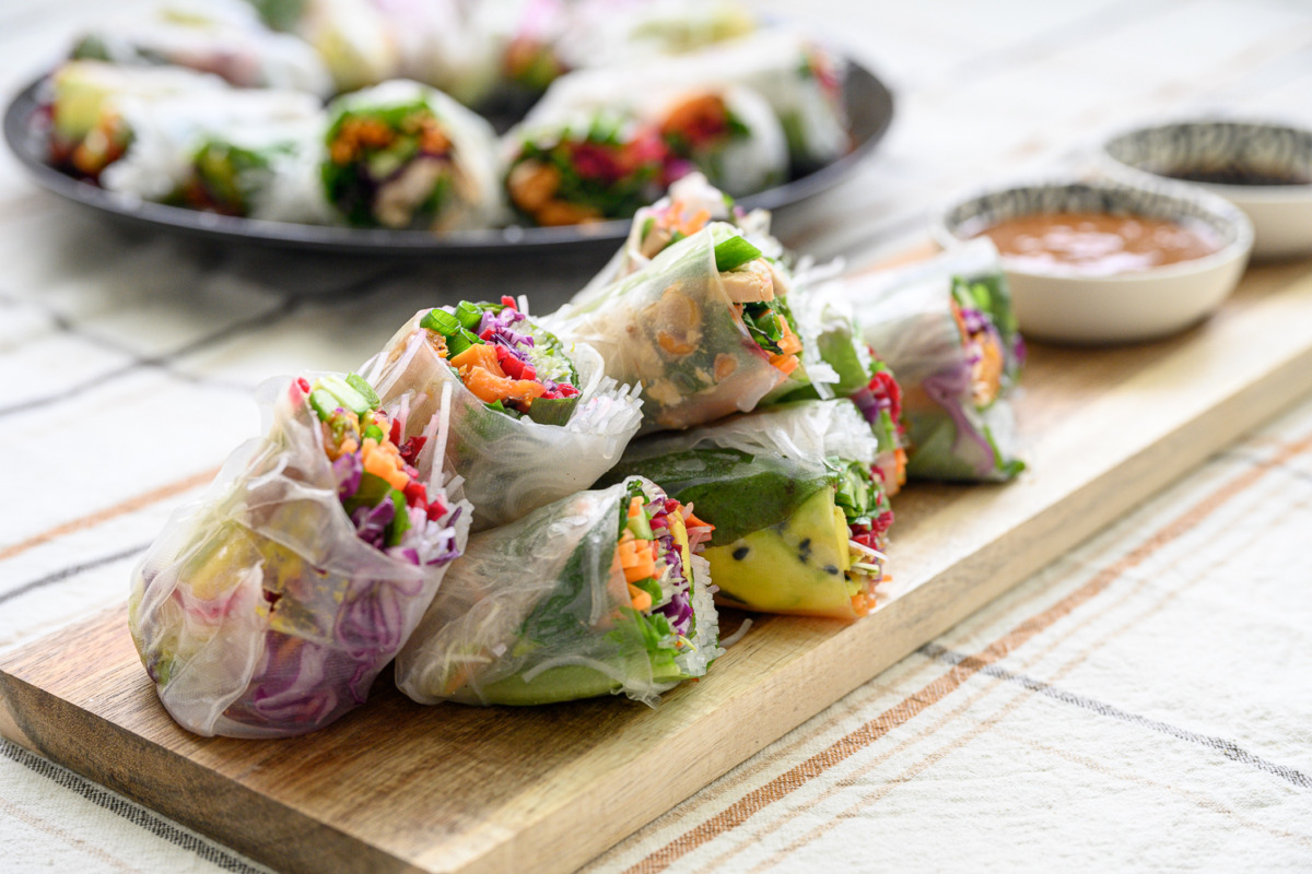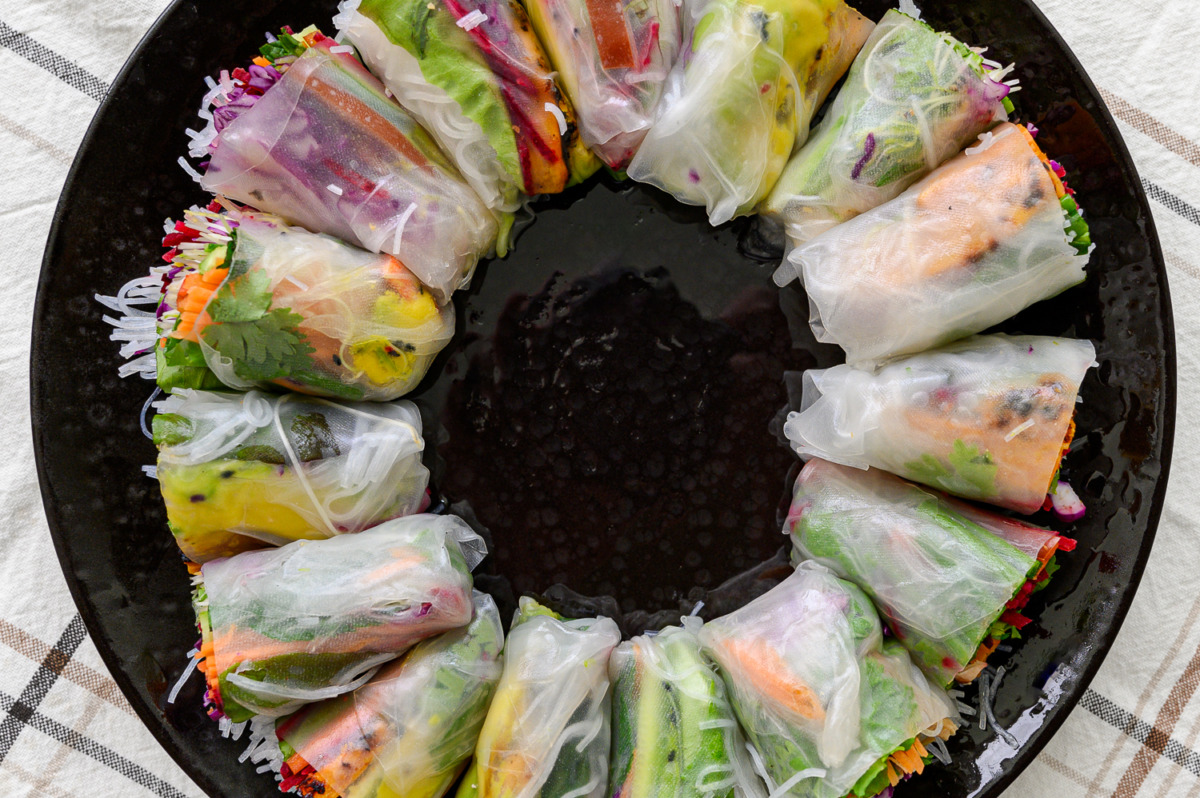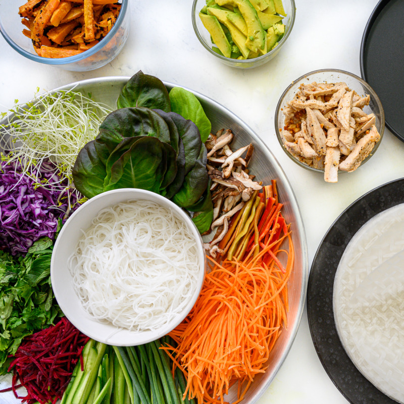 נטבול דף אורז באמבטיית מים קרים כחצי דקה, נניח במרכזו את הירקות שבחרנו לדוגמא: אבוקדו, גזר, נבטים, כרוב סגול, בצל ירוק נענע וכוסברה. נכרוך חופן אטריות בעלה חסה, נניח בצמוד לירקות נקפל פנימה כנף ימין ושמאל ונגלגל