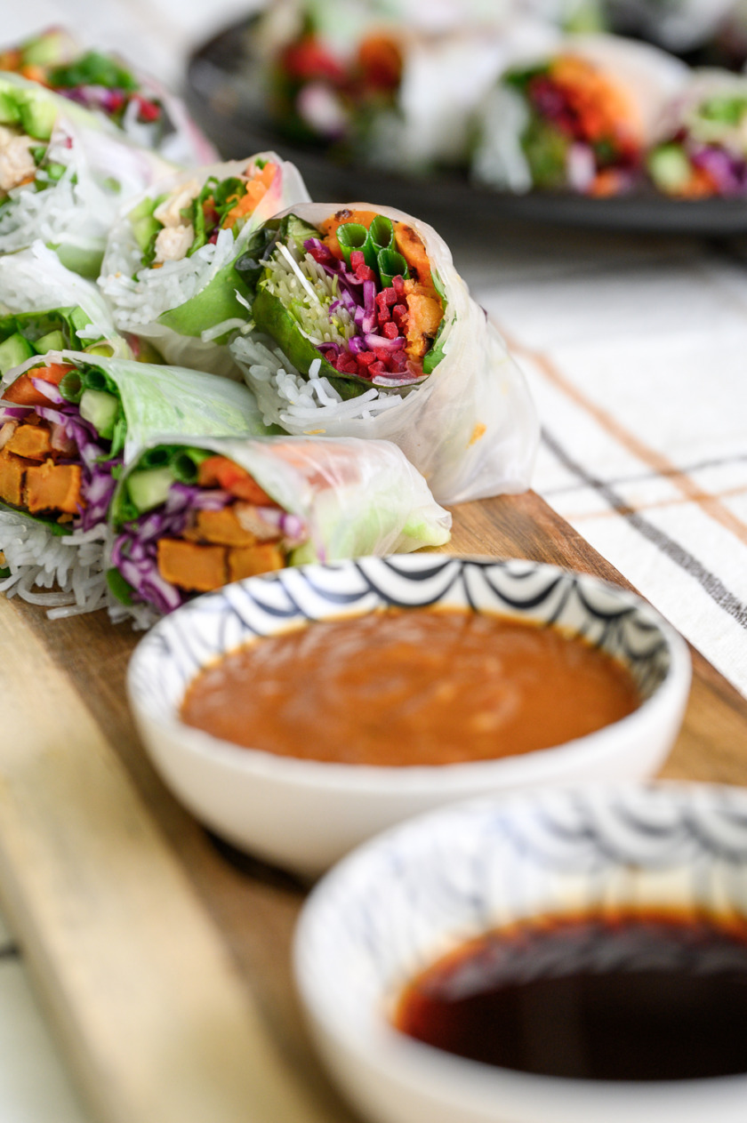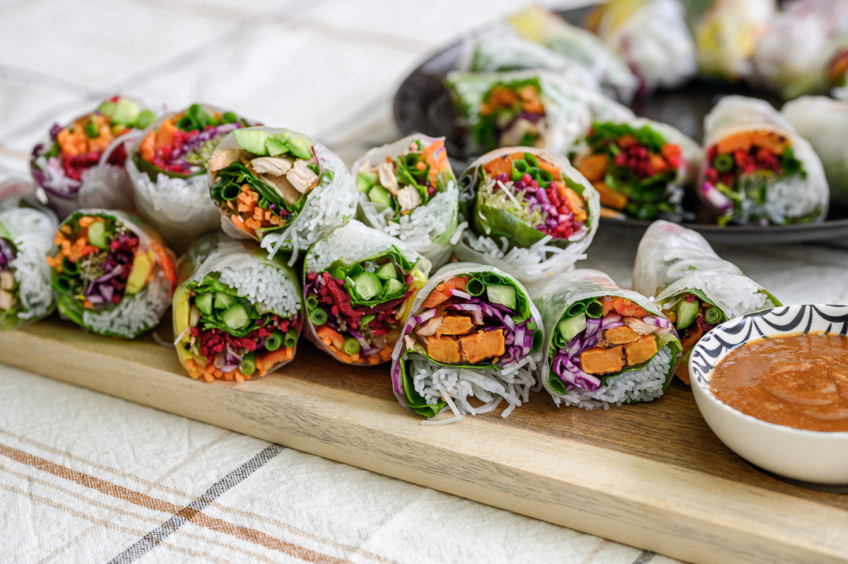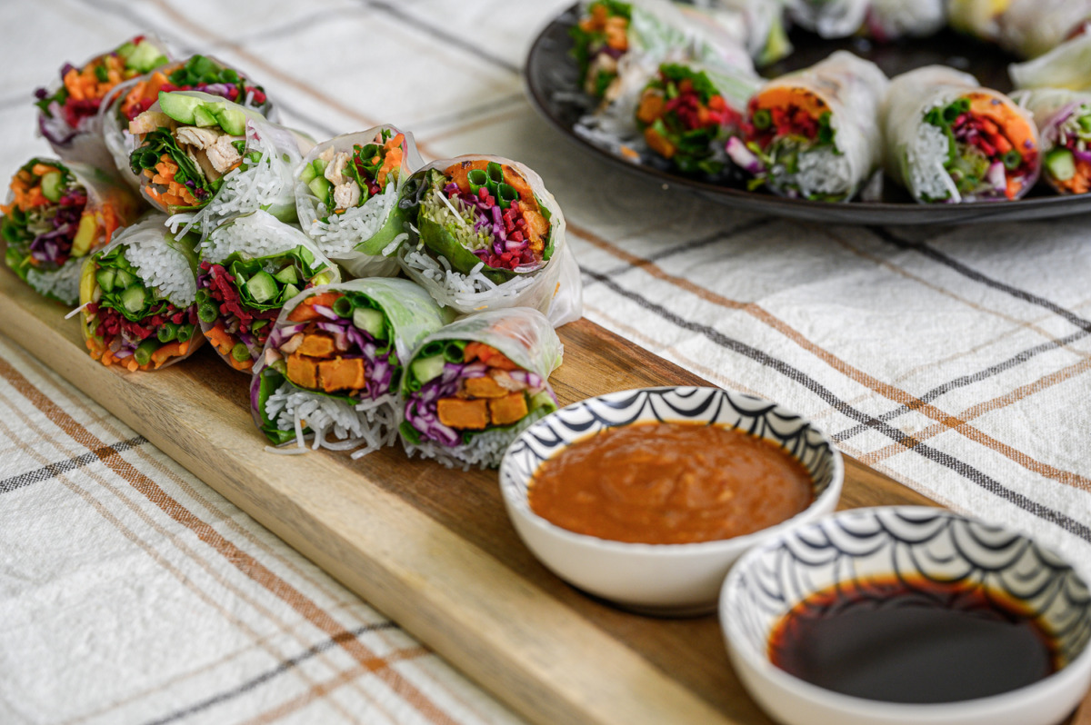 נטבול דף אורז באמבטיית מים קרים כחצי דקה, נניח במרכזו את הירקות שבחרנו לדוגמא: אבוקדו, גזר, נבטים, כרוב סגול, בצל ירוק נענע וכוסברה. נכרוך חופן אטריות בעלה חסה, נניח בצמוד לירקות נקפל פנימה כנף ימין ושמאל ונגלגל