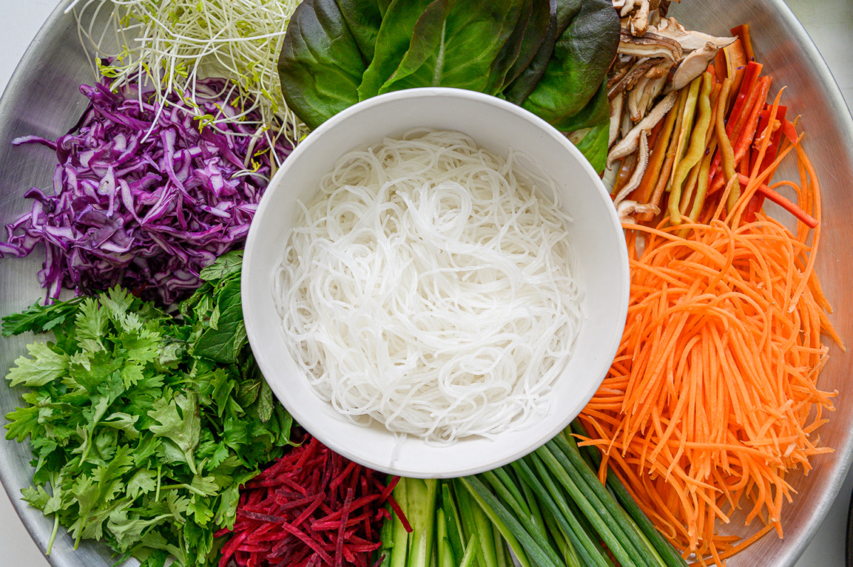 נניח מגש עם כל הירקות שחתכנו: גזר, מלפפון, סלק, כרוב, בצל ירוק, נבטים, אבוקדו, בטטה, נענע, כוסברה או בזיל, חסה ואיטריות שעועית