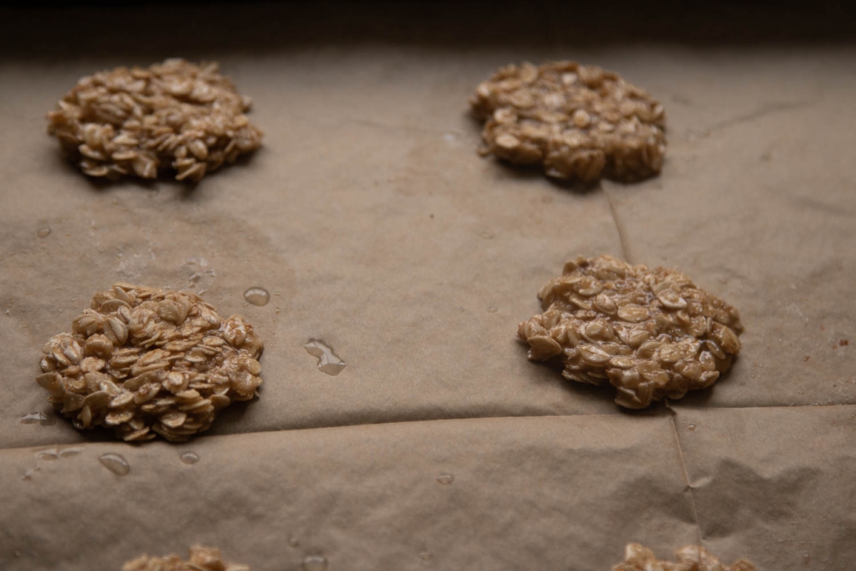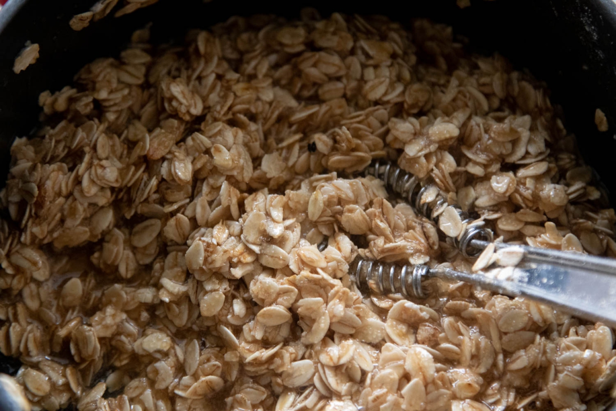 בקלחת נמיס יחדיו סוכר וחמאה, כשנמס נוריד מהאש את הנוזל הסמיך הזהוב, נערבב לתוכו רבע כפית מלח, תמצית וניל, ביצה, 2 כפות קמח, נטרוף טוף טוף, נוסיף את הקוואקר. נערבב טוב טוב.