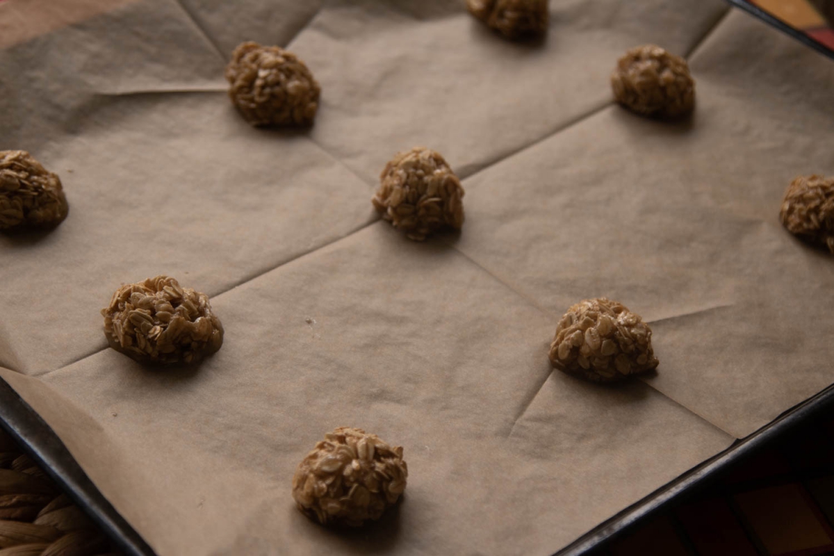 נרטיב את הידיים במעט מים ניצור עיגולים בגודל מסטיק עגול ונשטח אותם יפה על דף האפייה.