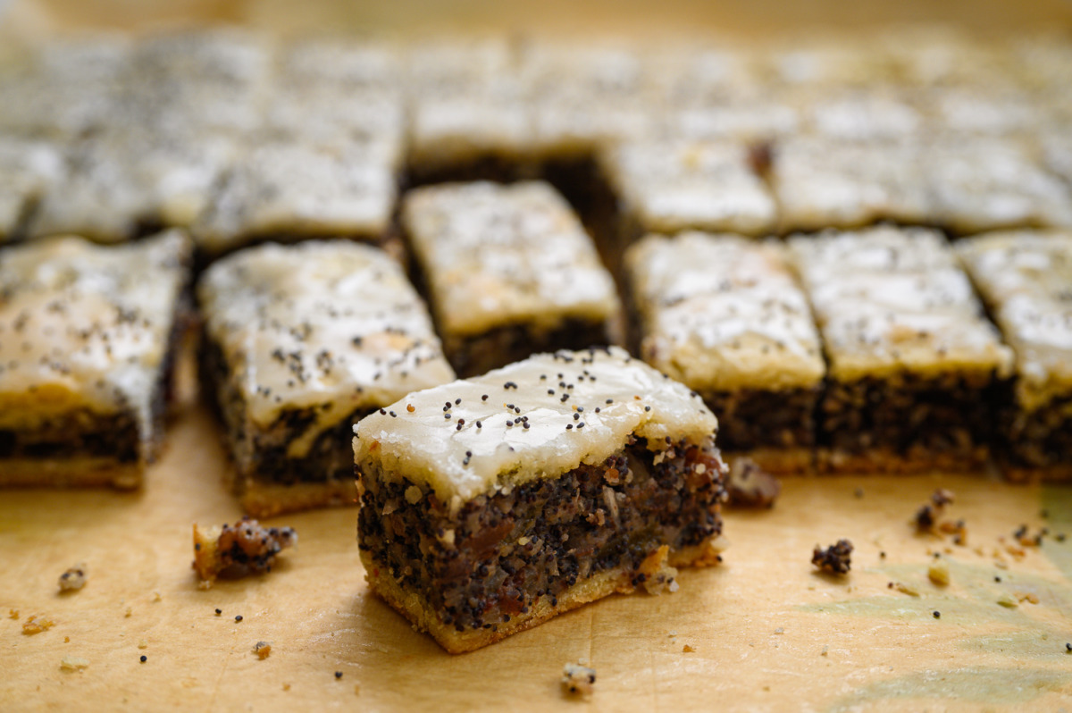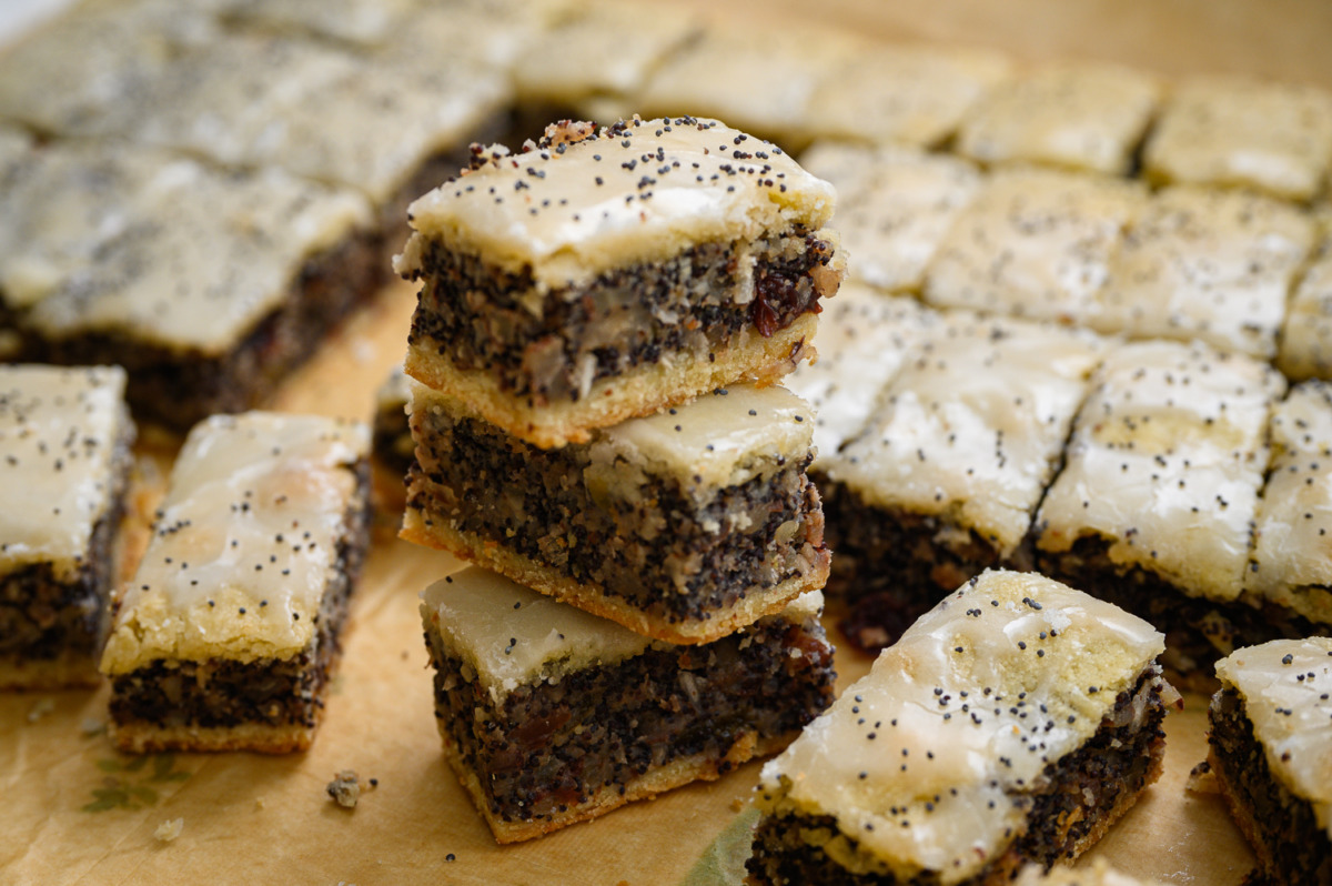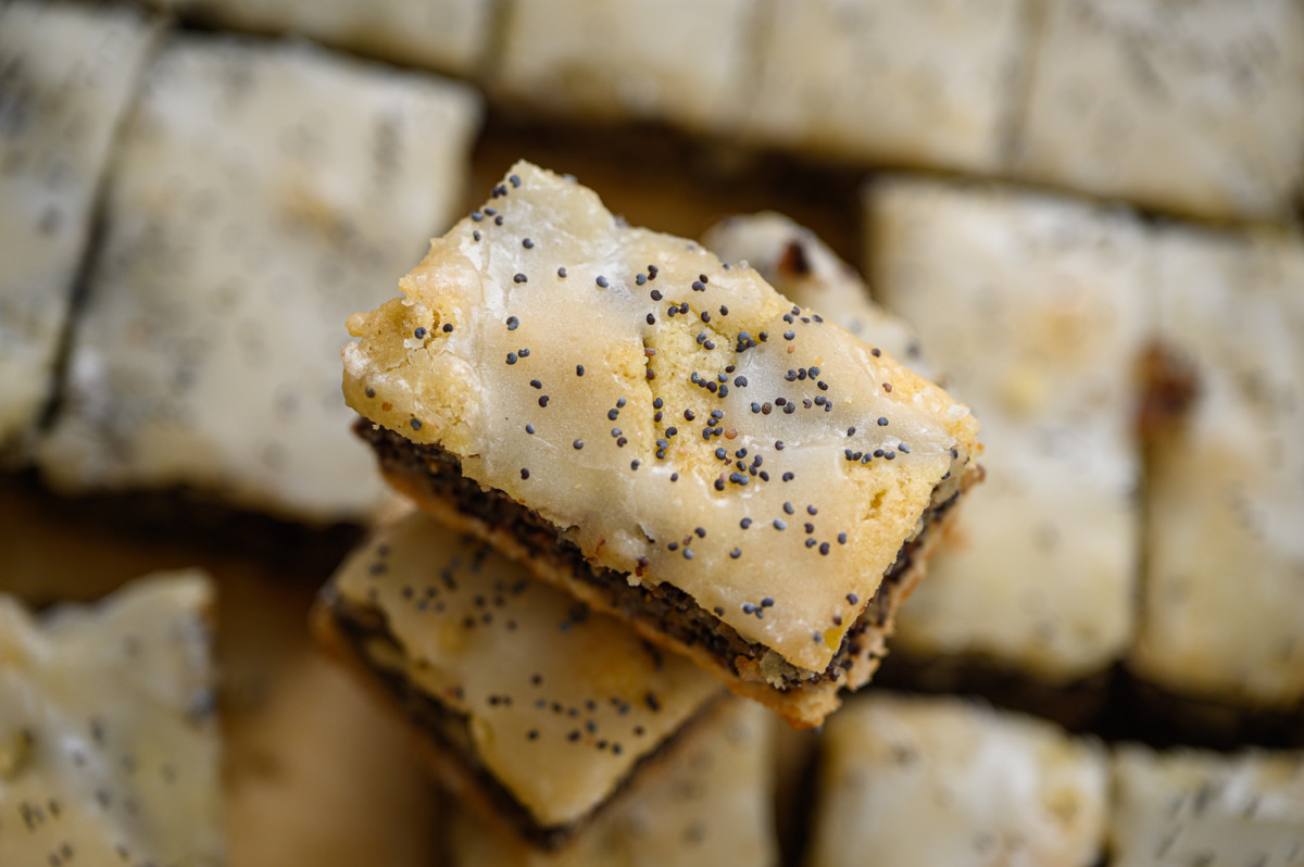 6. נזליף את הסירופ באופן מקושקש, או נבריש על פני כל העוגה. נפזר מעט פרג, נחתוך למלבנים בגודל של כ- 6X3 ס”מ, כשמתקרר נשמור בקופסה.