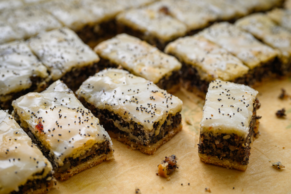 6. נזליף את הסירופ באופן מקושקש, או נבריש על פני כל העוגה. נפזר מעט פרג, נחתוך למלבנים בגודל של כ- 6X3 ס”מ, כשמתקרר נשמור בקופסה.