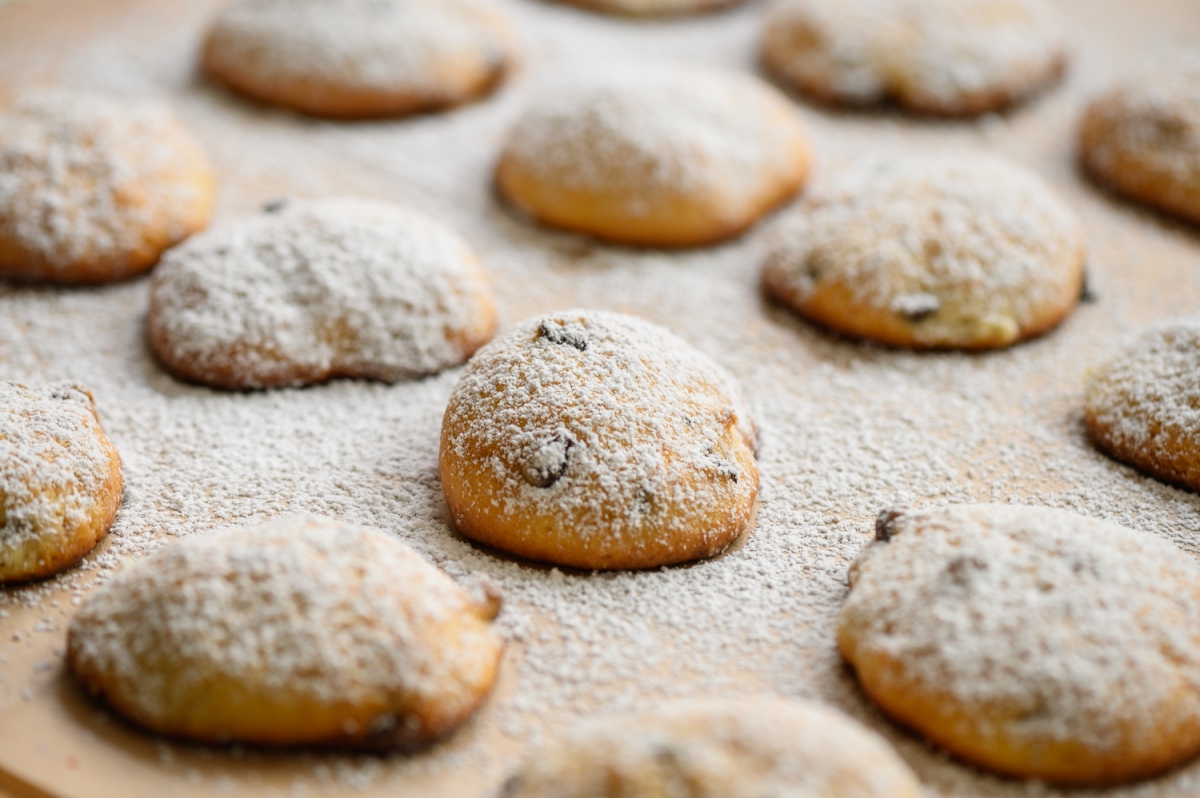 4. על דף אפייה נחליק בעזרת כף תלוליות של בצק עוגיות, נאבק באבקת סוכר
