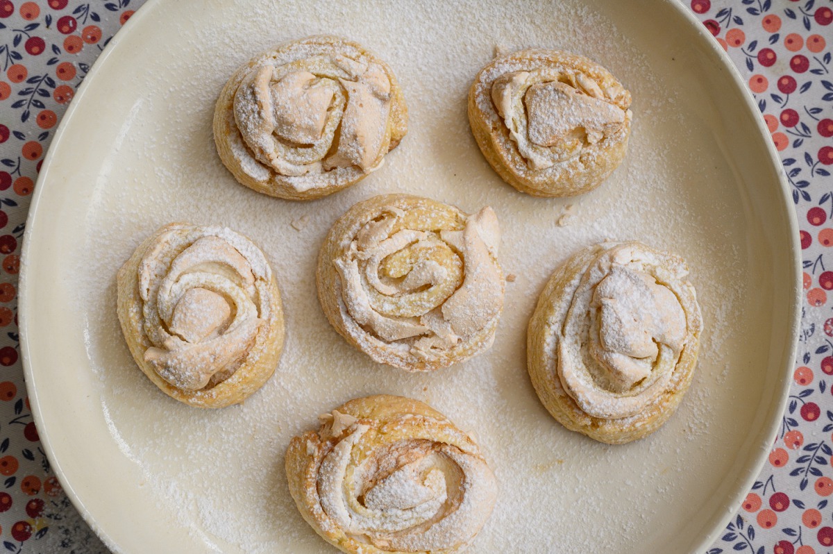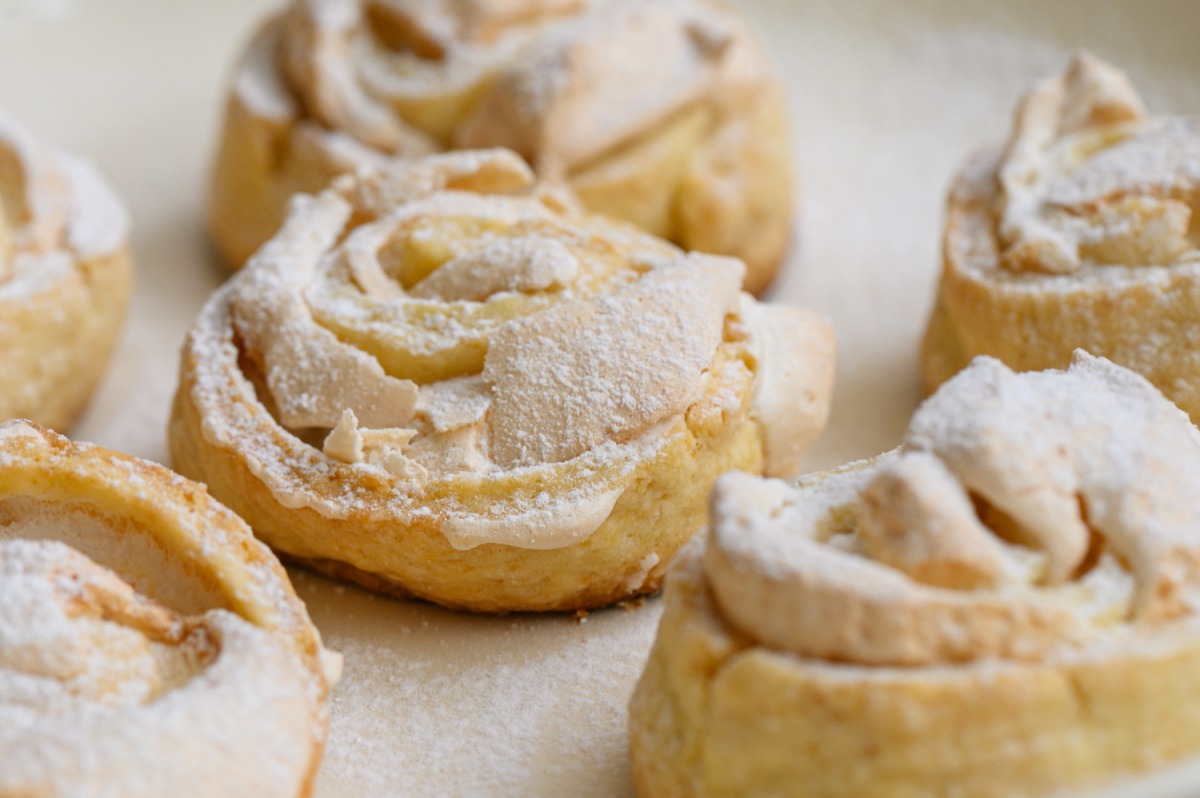 4. נמרח אותו בחצי מכמות המרנג, בשכבה אחידה של חלבונים ונגלגל בעדינות לרולדה, המרנג קצת יברח וזה בסדר לא להתרגש,  נחתוך לפרוסות שושנים בעובי 3-5 ס”מ (גם כאן המרנג קצת “יתגלץ’ וזה בסדר) נסדר על תבנית תנור מרופדת. לתנור 160 מעלות כ-18 -22 דקות. כשצבע השושנים זהוב  מעט לא שחום.