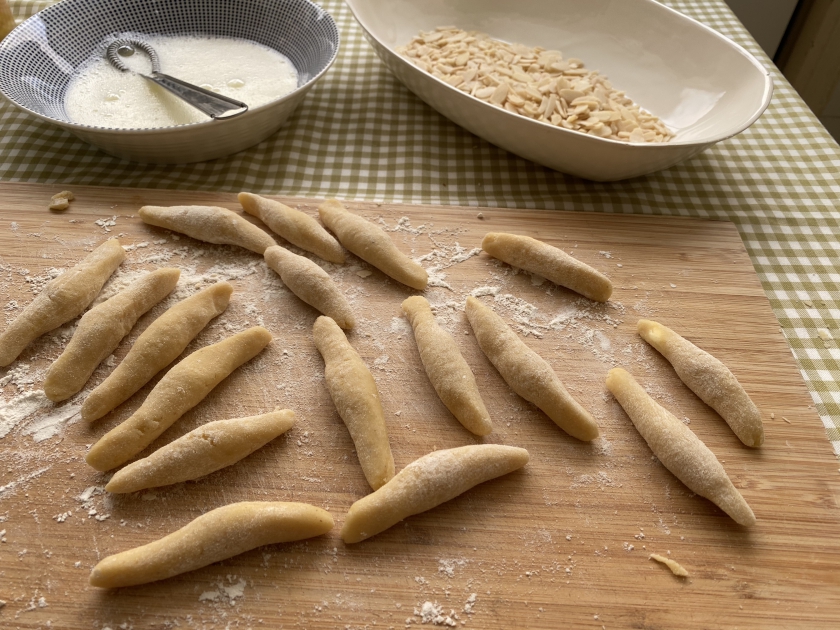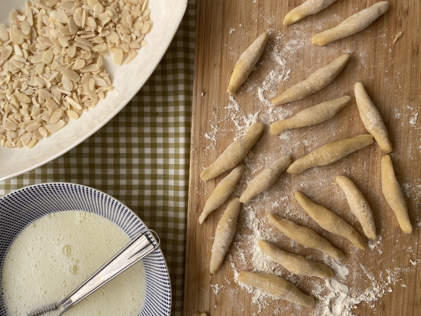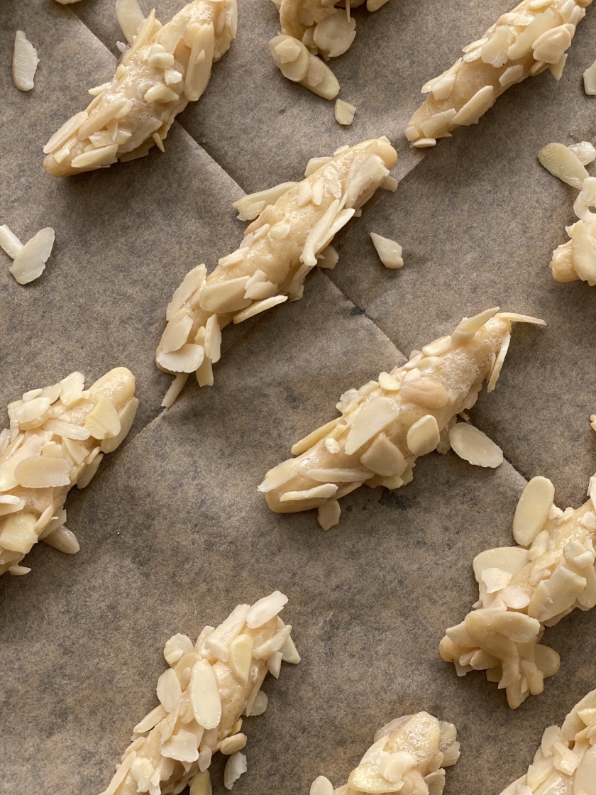1. בקערה גדולה נפורר עם הידיים את כל חומרי הבצק: חמאה, קמח, קמח שקדים, אבקת סוכר, גרד לימון, ברנדי, וניל, חלמונים, קורנפלור עד שנקבל חול חמאתי ונקבץ אותו לבצק, או פשוט במעבד כמה פעמים. נכדרר כדור בצק, נקמח עם כף קמח, נחלק לשניים את הבצק. ניצור נחש מכל עיגול ונחתוך אותו לסוכריות. כל סוכריה תהפוך לעוגיה חשופית.