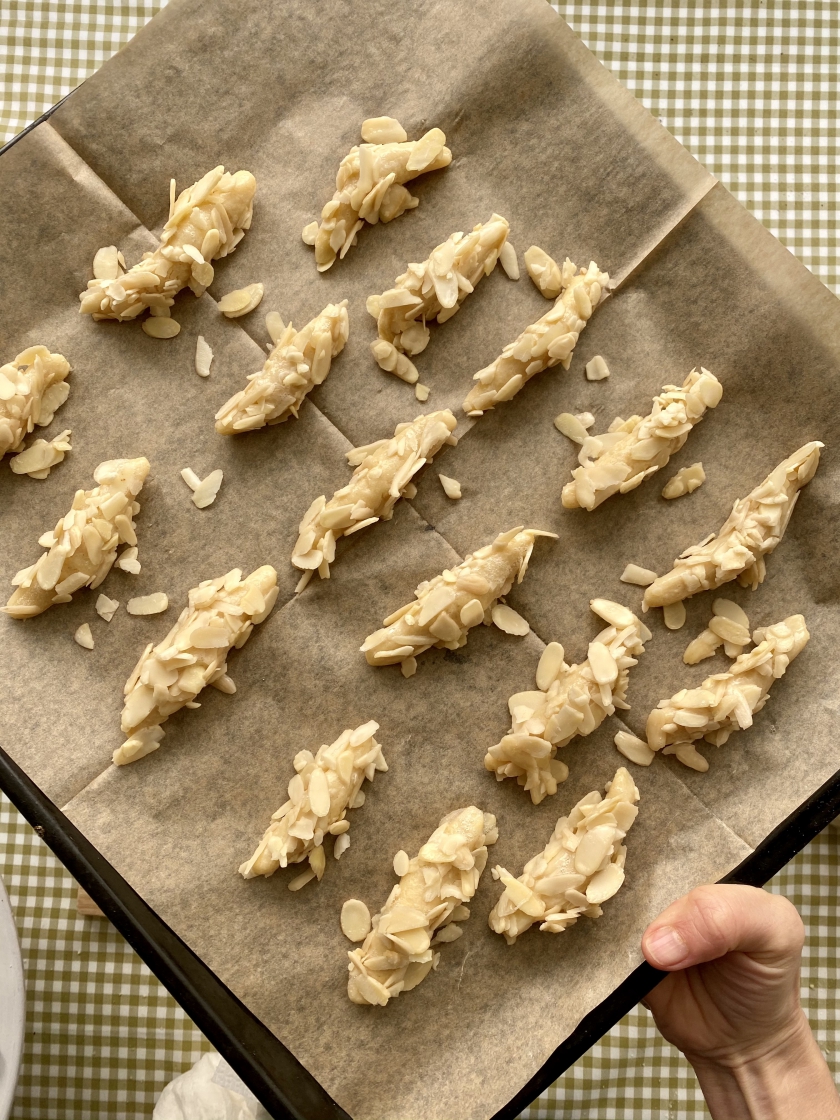2. נקציף עם מזלג קלות את החלבונים לקצף קל קל, נצפה עוגיה עוגיה בקצף החלבונים ואז נצפה בשקדים הפרוסים.