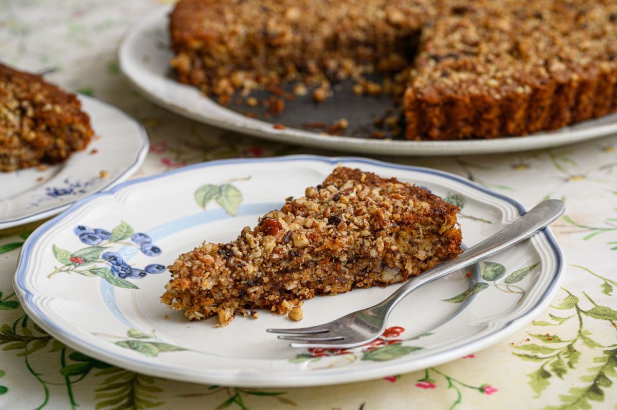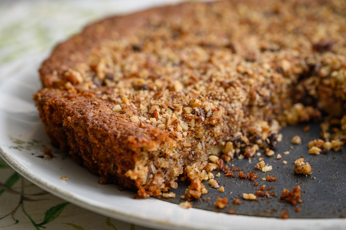 ניצוק לתבנית טארט 28 משומנת, לתנור 165 מעלות ל-8 דקות. אחרי 8 דקות נפזר את פירורי האגוזים והשוקולד על  העוגה, נחזיר לתנור לעוד 25 דק’.