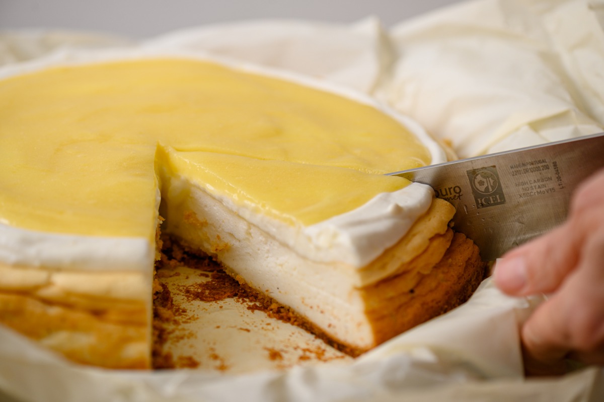 הקצפת – נכין את הקצפת רק כשעוגת הגבינה מתקררת היטב: נקציף שמנת מתוקה, נוסיף סוכר, שקית סוכר וניל, גרידת לימון כשמתייצב נוסיף יוגורט יווני עד קבלת קצפת יציבה. נמרח על עוגת הגבינה, נמרח ממעל את קרם הלימון. נכניס לקירור לפחות לשלוש שעות ומעלה.