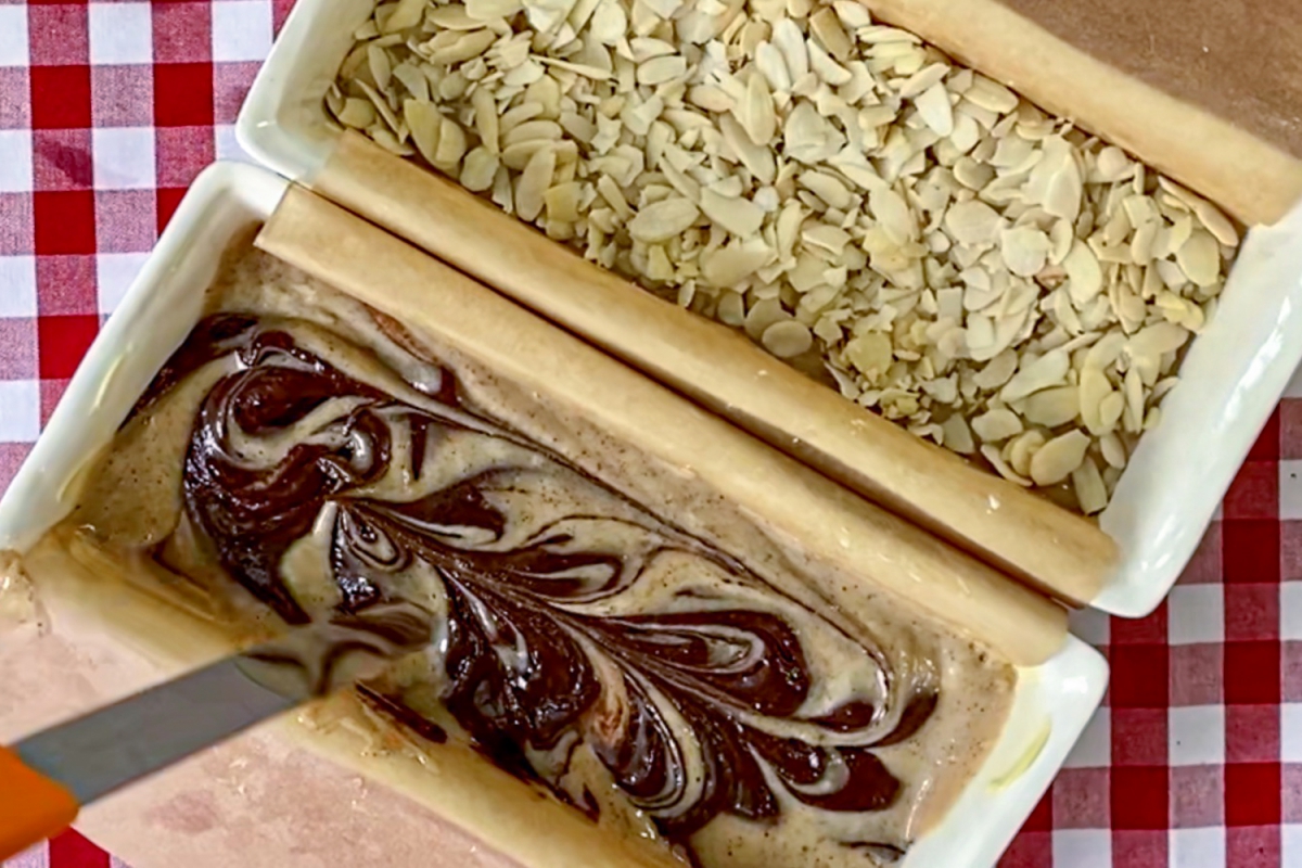 לדבש שקדים: ניקח את צמד התבניות המשומנות שלנו, חצי מכמות הבלילה ניצוק לתבנית אחת. הבלילה דלילה וככה היא צריכה להיות. נכסה את פני העוגה ב100 גר’ שקדים פרוסים מולבנים