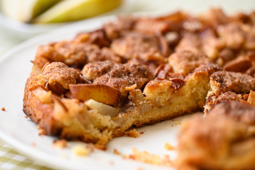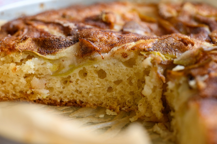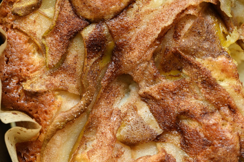 2. נשטח העוגה על תבנית פאי 24, עם קולפן נקלוף סרטים מ-2 אגסים ונפזר על פני העוגה יפה, נבזוק סוכר עם קינמון. נכניס לתנור רגיל 170 מעלות כ45 דקות.