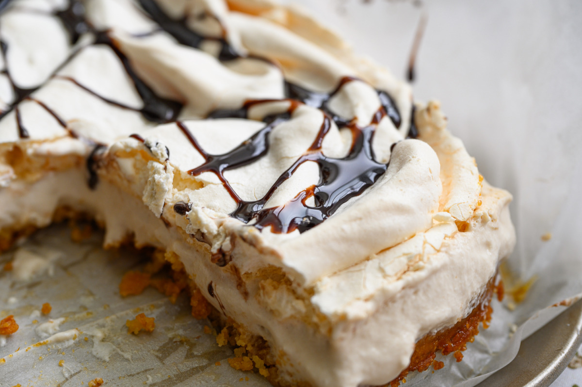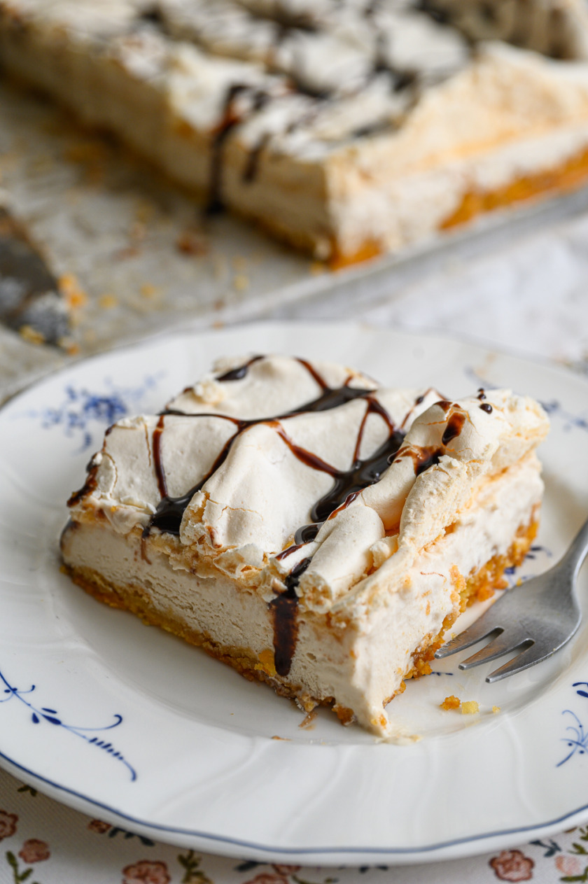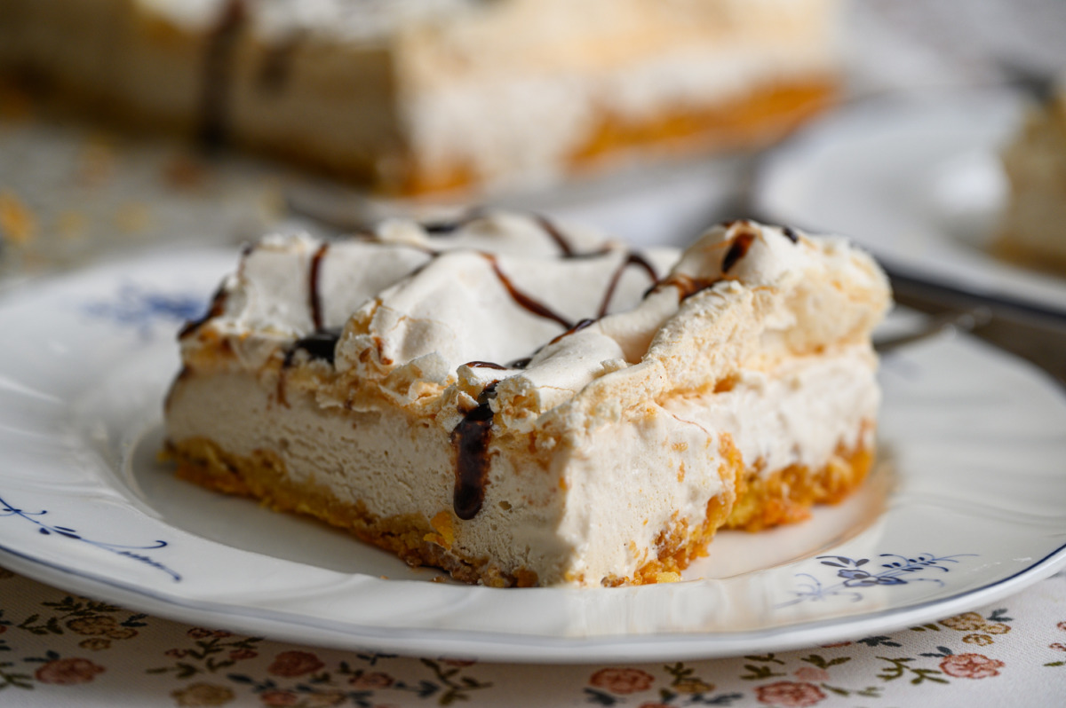 נקציף שמנת מתוקה עם אבקת סוכר ומנת אספרסו או נס קפה. עד שנקבל קצף יציב וטעים. נשטח הקצף על הבסיס, נניח מעל את דף המרנג (גם אם נשבר, לא נורא, נרצף מעל הקרם כמו פאזל)