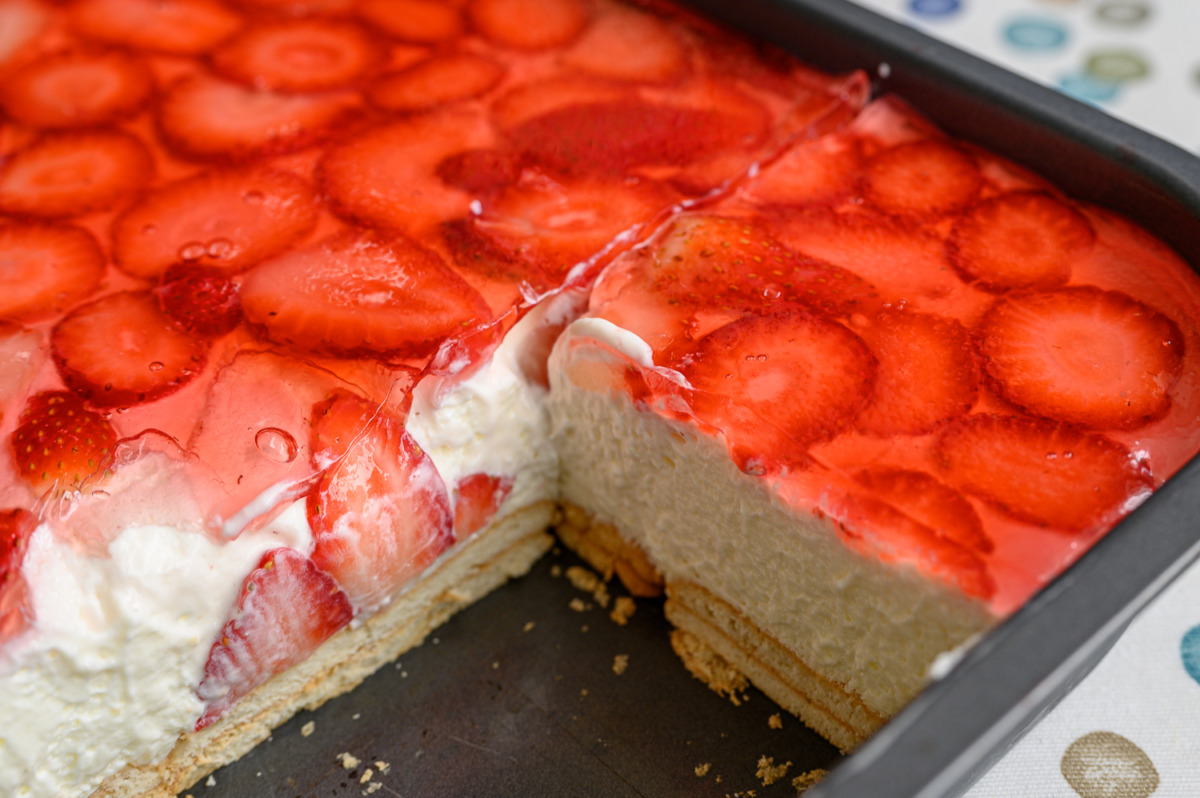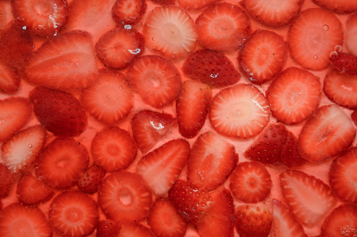 הציפוי: נחתוך תותים לפרוסות ונסדר פסיפס תותים יפה על כל הקרם צפוף צפוף שיהווה חיץ בים הקרם לג’לי.