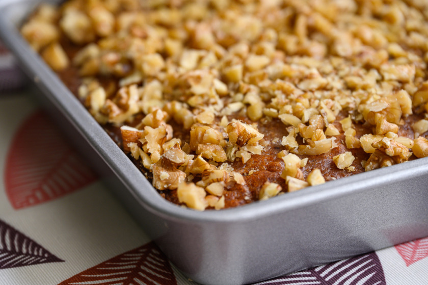 נערבב יחד: שמנת מתוקה עם מייפ ומלח, נערבב היטב, כשהעוגה יוצאת מהתנור עדיים חמה נחורר מעט עם מזלג וניצוק עליה נפזר אגוזים. נחזיר לתנור הכבוי עד שתתקרר לגמרי.