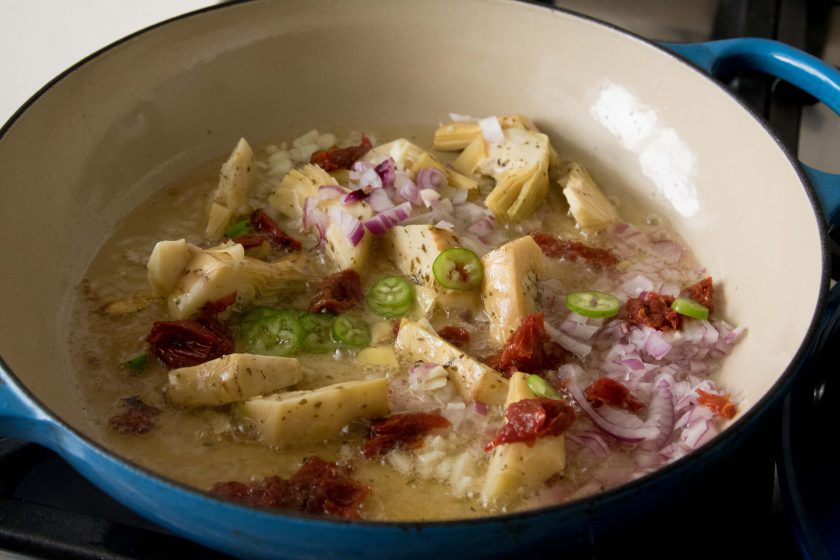 1. נטגן את הארטישוקים בחצי כוס שמן זית, (אם זה פונטי אז בשמן של הצנצנת הכי טעים בעולם) נוסיף קוביות הבצל, עגבניות מיובשות, שום כתוש, חומוסים, פפריקה פלפל שחור כ- 7 דק’
