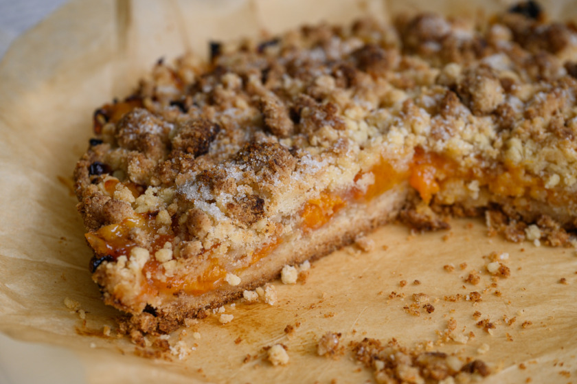 נערבב קמחים, אבקת סוכר ומלח עם חצי כוס שמן לפירורים חצי מהכמות נשטח על דף אפייה משומן. נהדק היטב, נמרח ריבה ומעל כף קמח שקדים או סולת, מעל נערום מישמשים, נפזר פירורים ומעל נבזוק כף סוכר