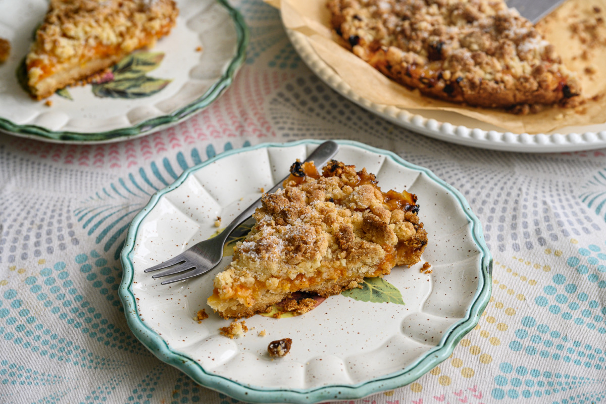נערבב קמחים, אבקת סוכר ומלח עם חצי כוס שמן לפירורים חצי מהכמות נשטח על דף אפייה משומן. נהדק היטב, נמרח ריבה ומעל כף קמח שקדים או סולת, מעל נערום מישמשים, נפזר פירורים ומעל נבזוק כף סוכר