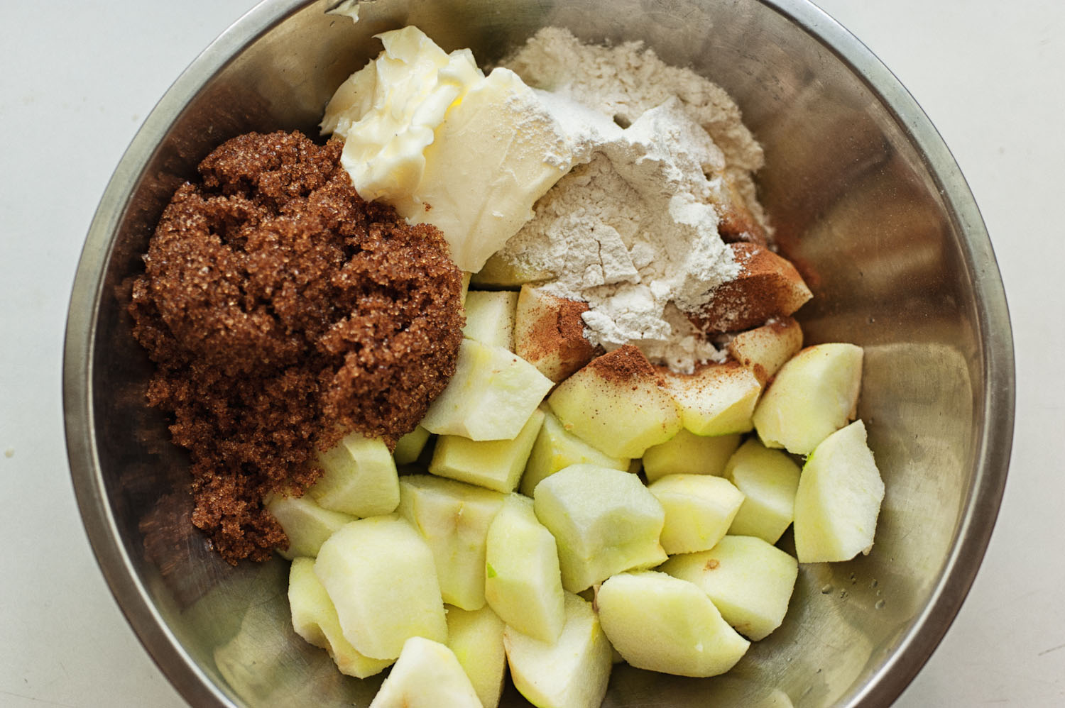 7 תפוחים קלופים חתוכים + כוס סוכר חום + כפית גדושה קינמון + מיץ מחצי לימון+ 2 כפות קמח + קוביות קטנות של 50 גר’ חמאה