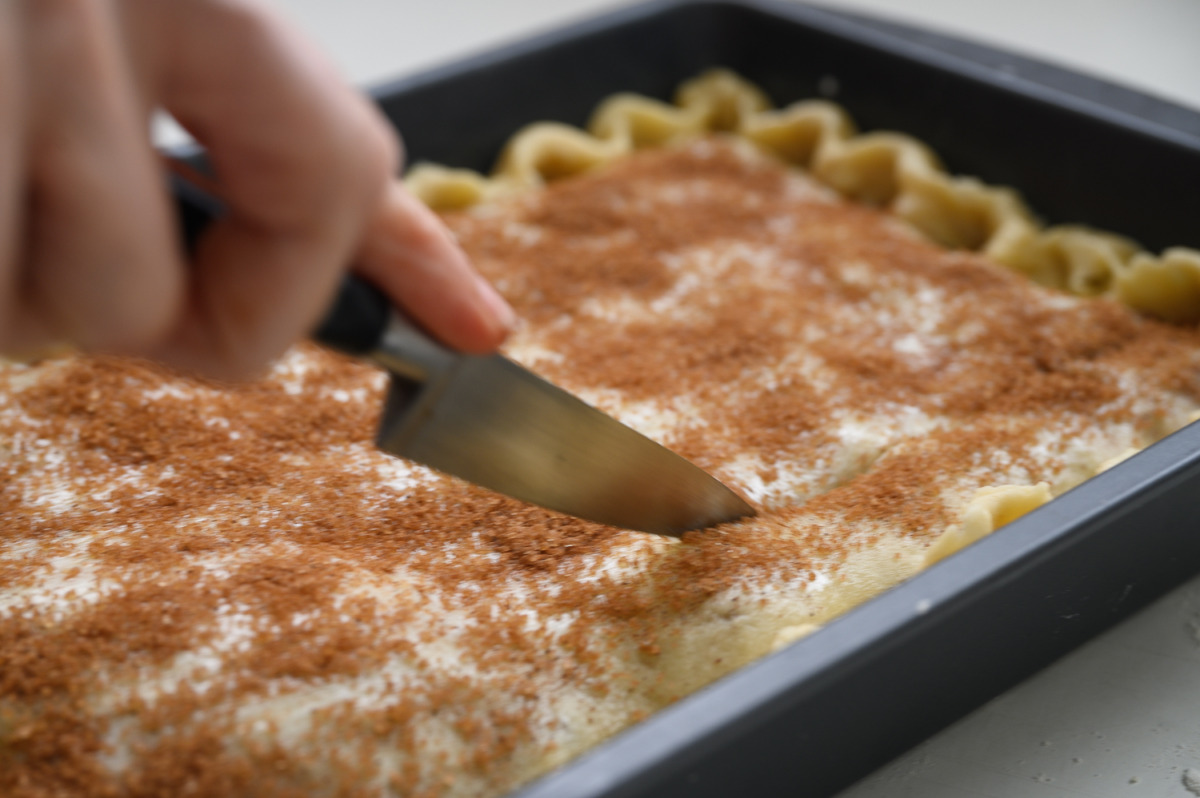 5. ניצוק התפוחים על העלה התחתון וניישר מעט עם לקקן, נרדד עלה עליון ושוב נרים בעזרת מערוך, נצבוט את החלק העליון עם התחתון ונקפל שוליים פנימה.עם סכין חדודה נחרוץ פתחי אוורור, אפשר בצורות יפות ואפשר סימון חתוכיות, ננבריש שמנת מתוקה, נבזוק סוכר. לתנור שעה 170 מעלות.