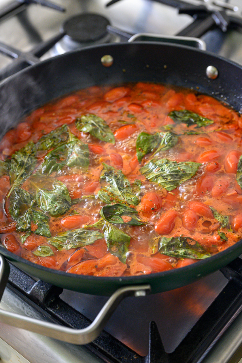 נכניס לסיר לפי הסדר הזה: שמן זית, עגבניות שרי, בלסמי על העגבניות, פסטה, שיני שום פרוסות, עלי בזיליקום, רסק, מלח, אורגנו וסוכר חום. נוסיף מים רותחים ונערבב היטב.
