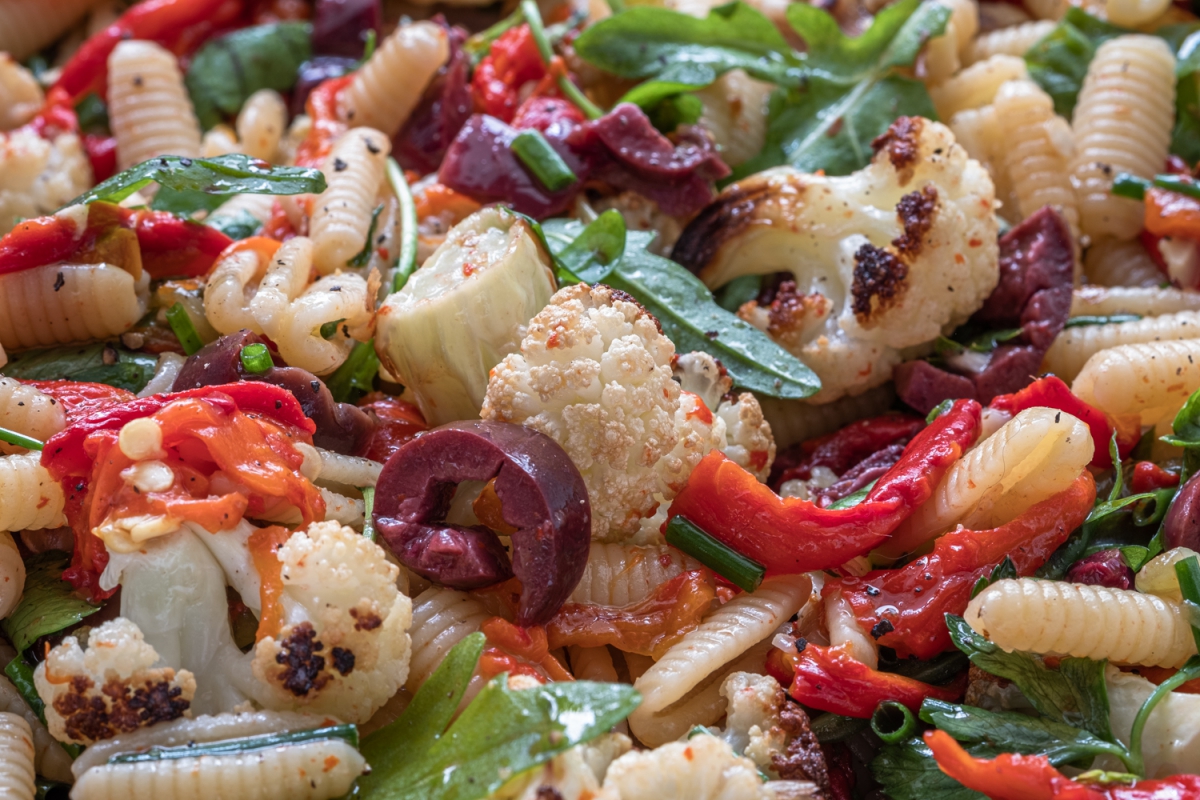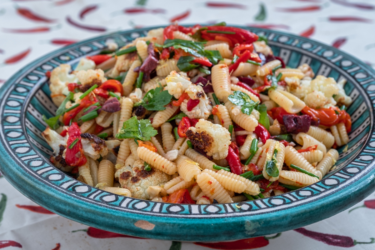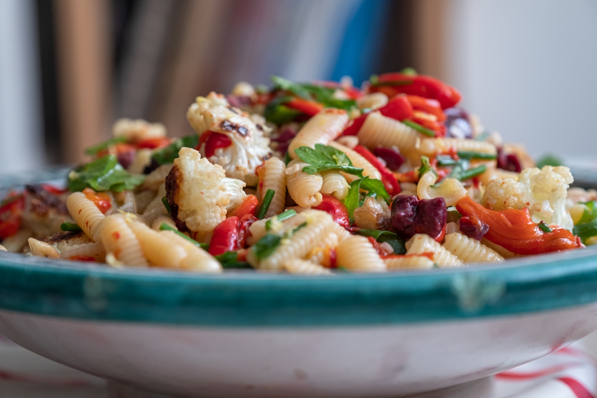 4. נרכיב מנה: פרחי כרובית צלויים, פסטה מבושלת, פלפלים צלויים, עלי רוקט טריים, עירית קצוצה, זיתי קלמטה קצוצים, נערבב. נוסיף רוטב, נערבב שוב, נעטר בצנוברים. אם צריך נתקן תיבול. נטרוף!