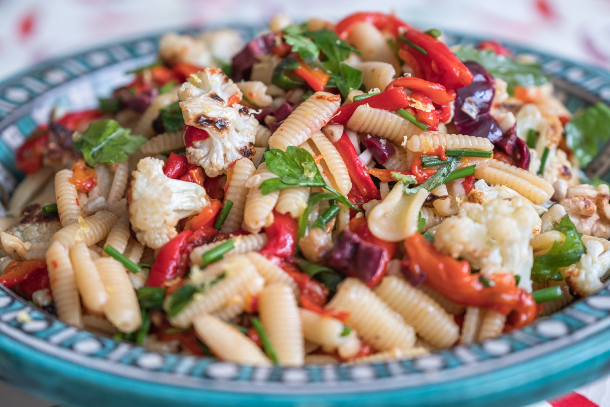 4. נרכיב מנה: פרחי כרובית צלויים, פסטה מבושלת, פלפלים צלויים, עלי רוקט טריים, עירית קצוצה, זיתי קלמטה קצוצים, נערבב. נוסיף רוטב, נערבב שוב, נעטר בצנוברים. אם צריך נתקן תיבול. נטרוף!