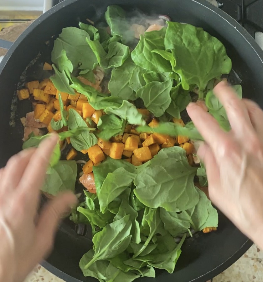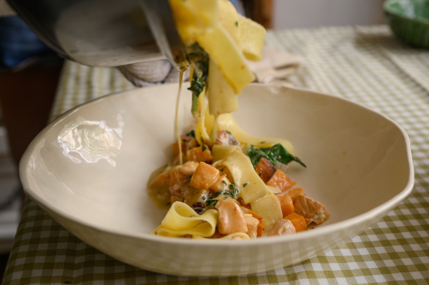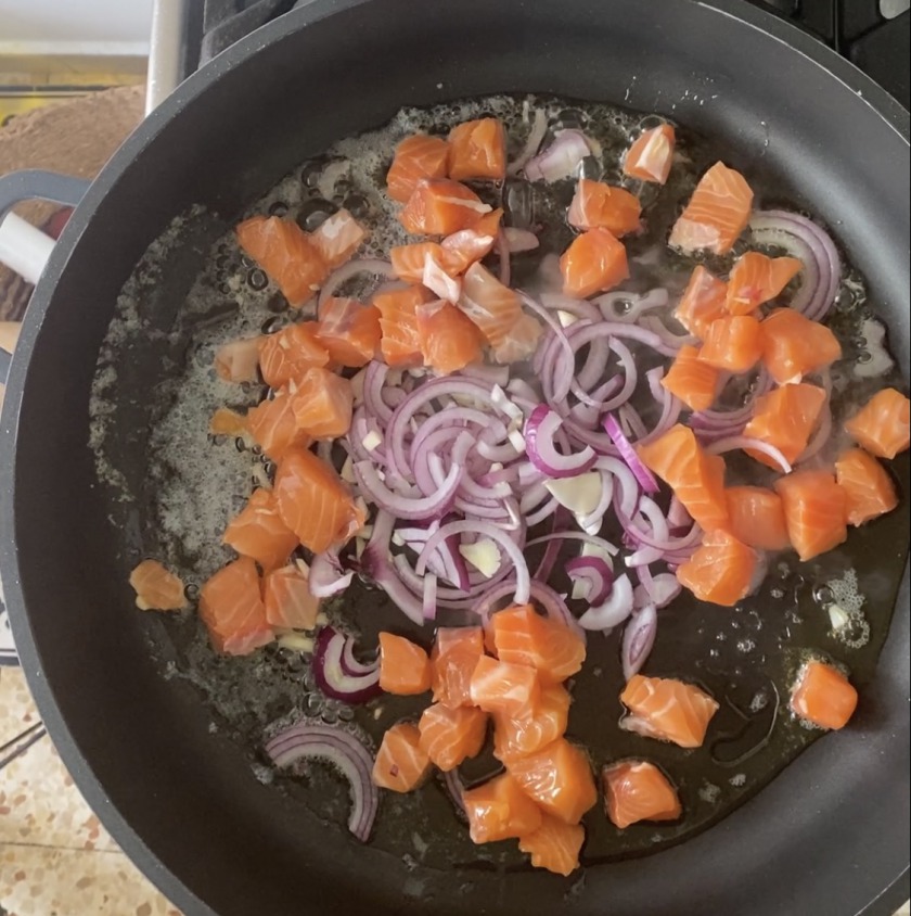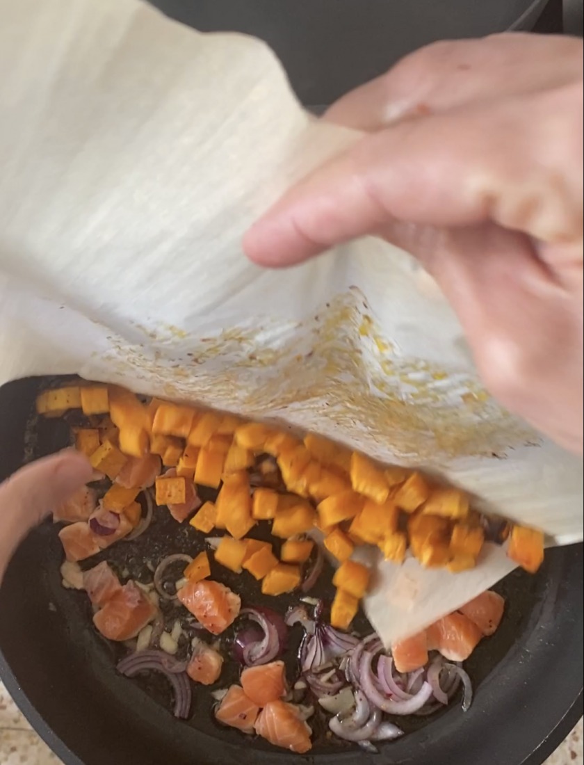 2. סלמון והרכבה – בסיר שטוח ורחב (עדיף נון סטיק) על הלהבה הגבוהה נחמם חמאה קרה, 2 כפות שמן זית, נוסיף את הבצל הסגול, השום הפרוס, וקוביות הסלמון, נשקשק את הסיר (חלילה לא נערבב עם כף אחרת הסלמון יתפרק) עד שנראה שהסלמון מזהיב יפה, נוסיף את קוביות הבטטה, התרד, גרידת לימון, עם מצקת נעביר חצי כוס ממי הפסטה הרותחים ונוסיף לסיר שלנו, נשקשק שוב, נוסיף שמנת מתוקה, חצי כפית מלח, חצי כפית צ’ילי גרוס וטעים מאוד מעט אגוז מוסקט מגורר, נעטר בפטרוזיליה, נעביר את הפסטה המוכנה להיכרות קרובה עם הסלמון והבטטות, נשקשק מעט, נגרד ממעל המון פרמז’ן. נגיש מיד.