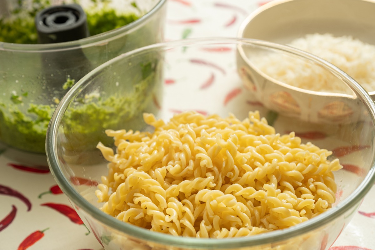 נערבב את הפסטו עם הפסטה, נפזר פרמז’ן מגורר מעל.