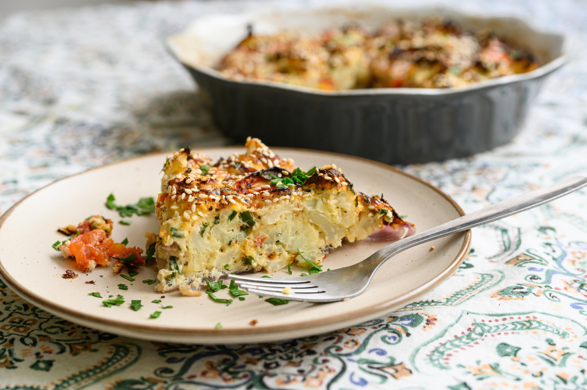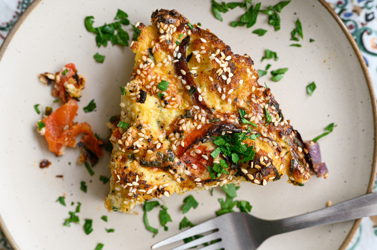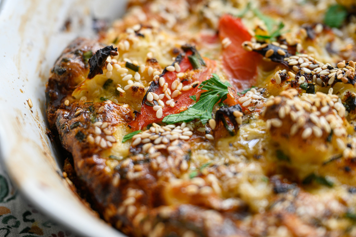 בקערה נטרוף יחדיו 3 ביצים, חלב, שמן זית, שום גבישי, עירית, מלח פלפל, אורגנו, 2 כפות קמח תופח, נגליץ’ את כל הירקות שקירמלנו בתנור, נערבב, ניצוק לתבנית עגולה או ריבועית, נפזר שומשומין. נשגר לתנור חום 180 מעלות כ-40 דקות. טעים