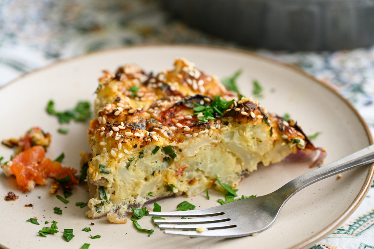 בקערה נטרוף יחדיו 3 ביצים, חלב, שמן זית, שום גבישי, עירית, מלח פלפל, אורגנו, 2 כפות קמח תופח, נגליץ’ את כל הירקות שקירמלנו בתנור, נערבב, ניצוק לתבנית עגולה או ריבועית, נפזר שומשומין. נשגר לתנור חום 180 מעלות כ-40 דקות. טעים