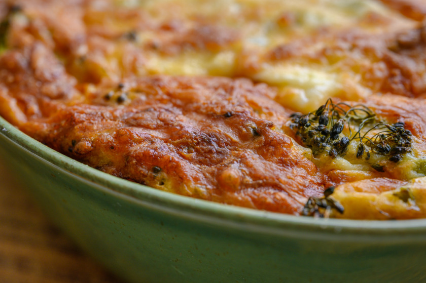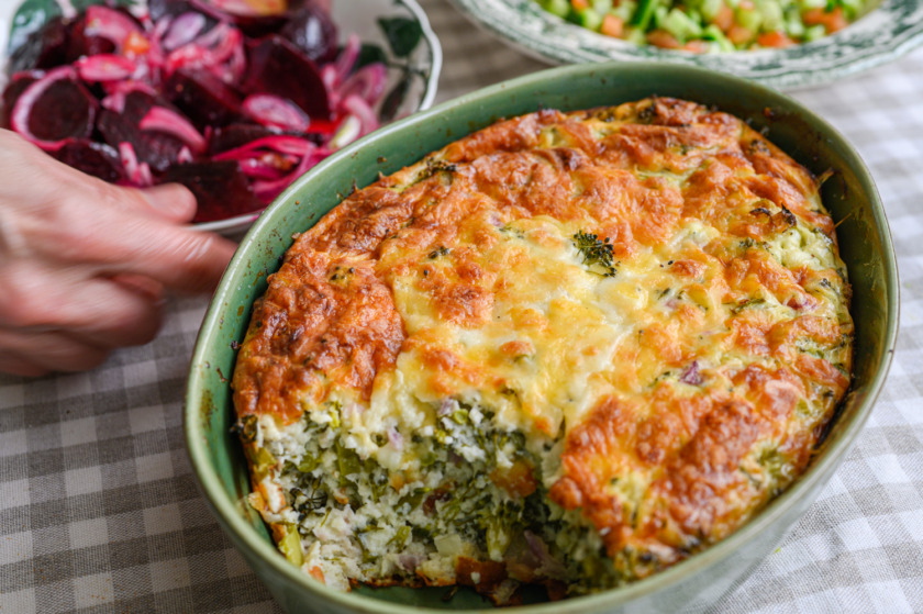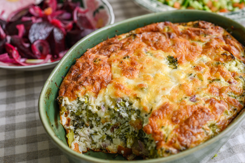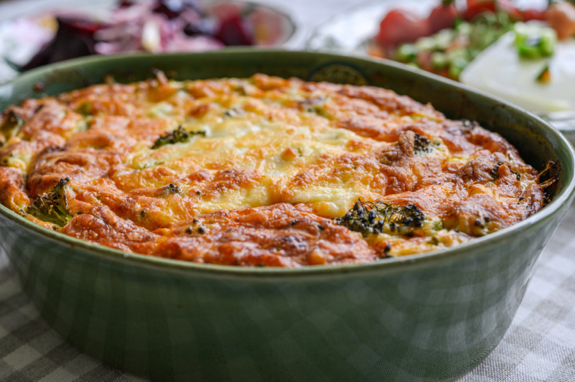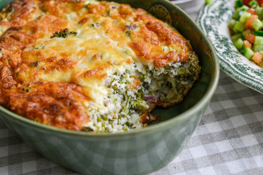 2. נכניס לקערה לפי הסדר הזה: 3 ביצים, גבינה לבנה, עוגורט יווני, 2 שיני שום כתושות, חצי כוס חלב, נערבב היטב, נוסיף 2 כפות קמח תופח עם כפית מלח ופלפל שחור, נערבב בצלים וברוקולי, ניצוק לתבנית משומנת נפזר ממעל 2-3 כפות גבינה קשה מגורדת