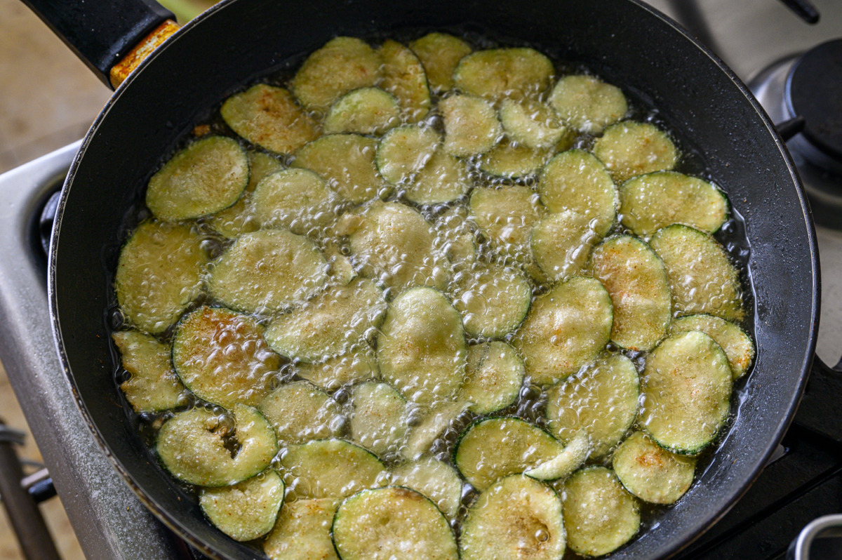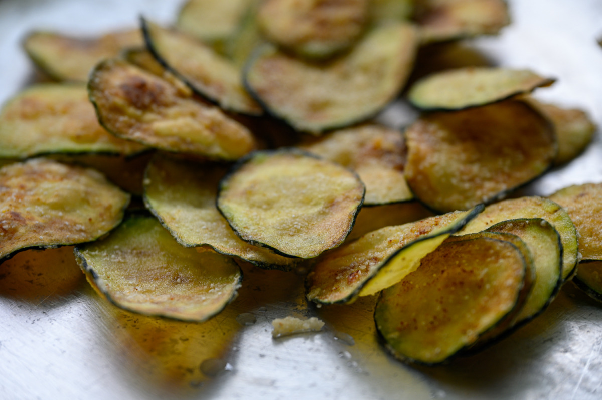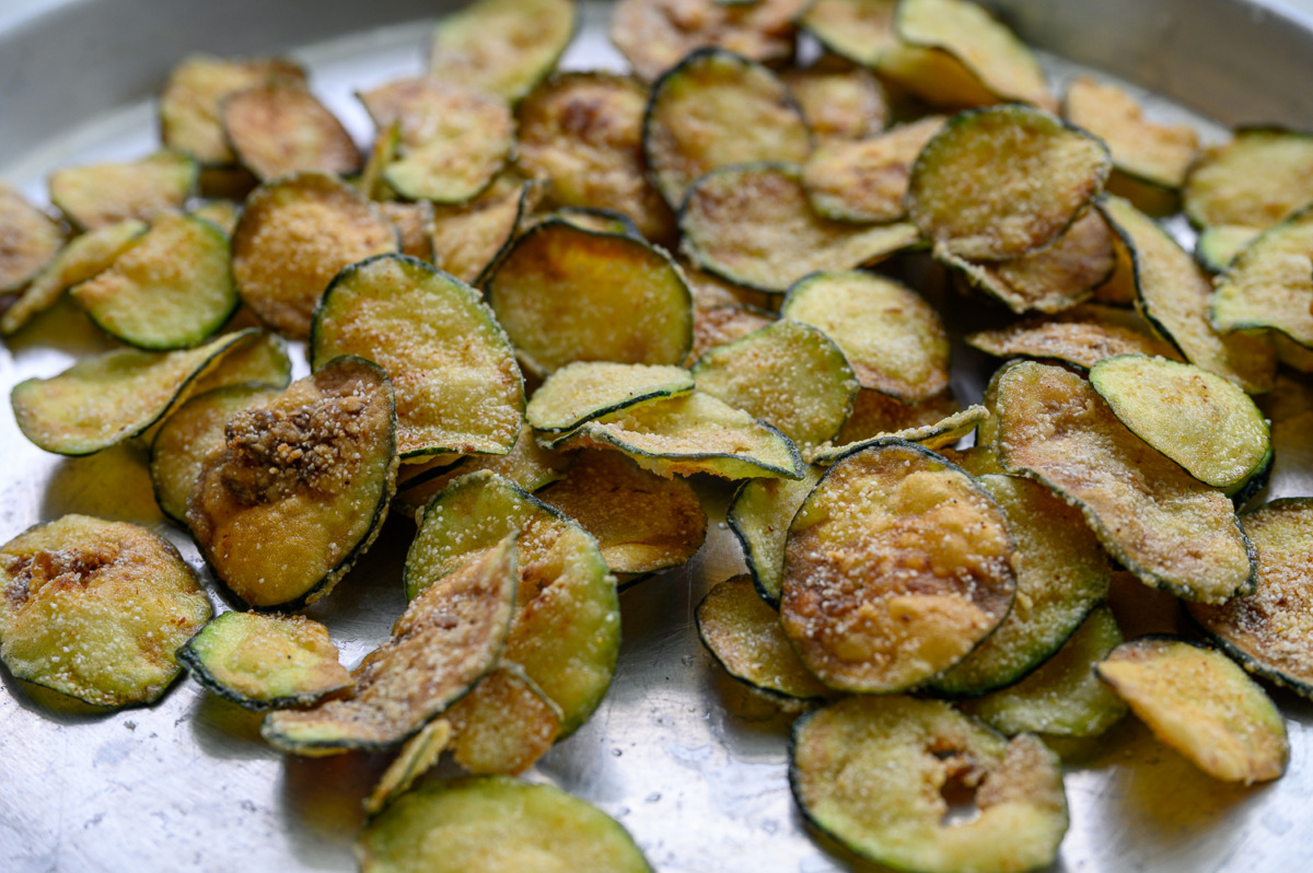 הצ’יפס: נבזוק חצי כפית מלח על פרוסות הזוקיני עד שיזיעו, נשטוף את זעתם במים מהברז, נניח את פרוסות הזוקיני על מגבת מטבח ונייבש קלות. בתבנית נערבב קמח, סולת, תבלינים ומלח ונכניס את פרוסות הזוקיני שיצפו את הזוקיני היטב.