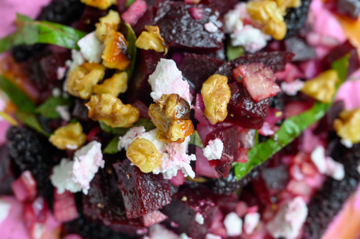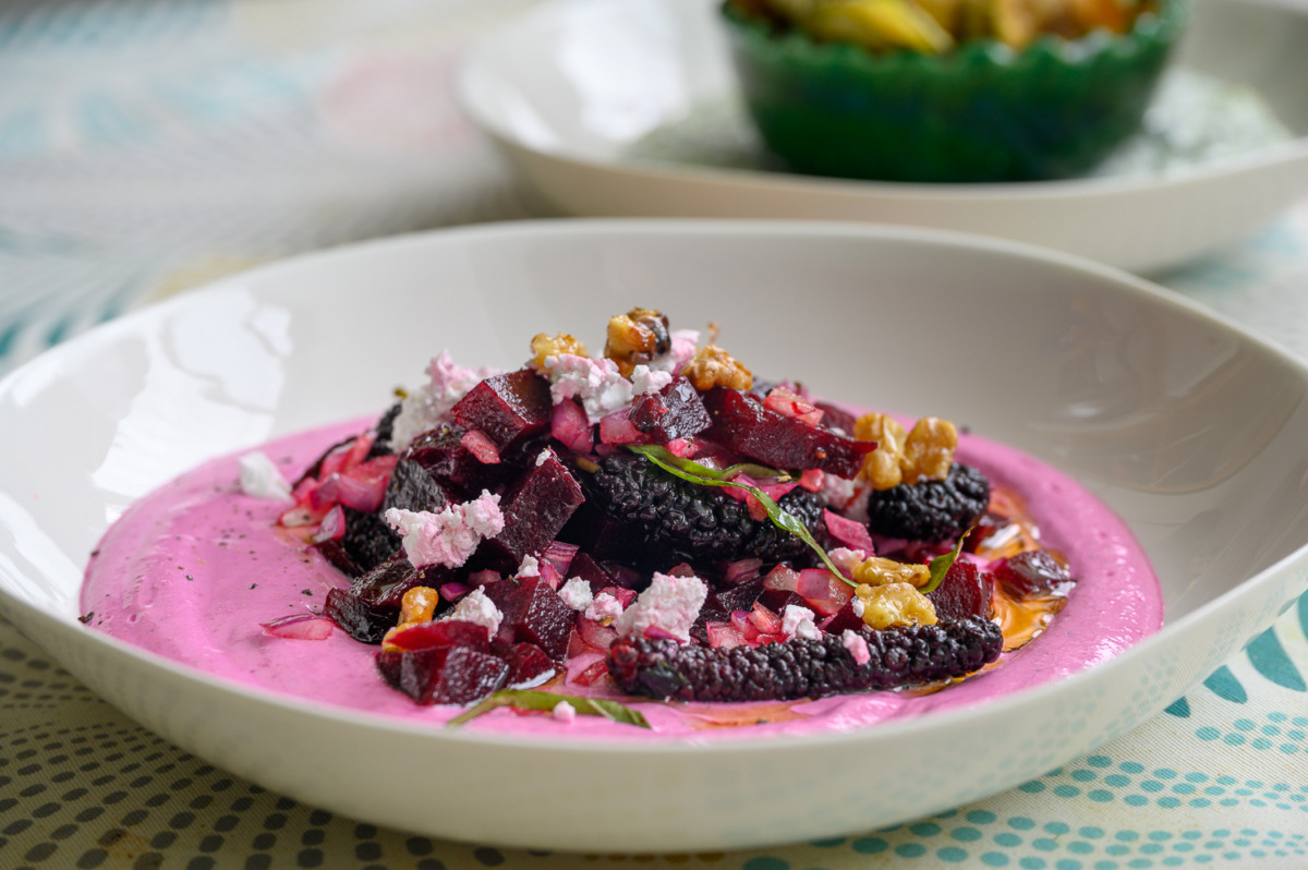אני משוגעת על סלק. כל פעם מגלה עוד צורה: חי, מבושל, אפוי. אין על סלק. שופע בויטמינים, סיבים תזונתיים וברזל (למי שסובל מאנמיה), מנקה ומסלק את כל הדרעק שבגוף ויש בו מתיקות נפלאה. ובכלל אני מהאסכולה שמאמינה שסלק סלק תרדוף. משתדלת לאכול סלק פעם בשבוע קבוע. הפעם הכנתי סוג של צזיקי ורוד אופטימי עם סלט נהדר של סלק, אגוזים ותותי בר. תהנו