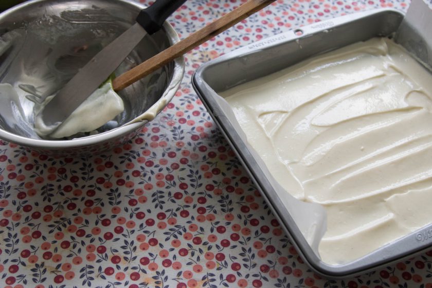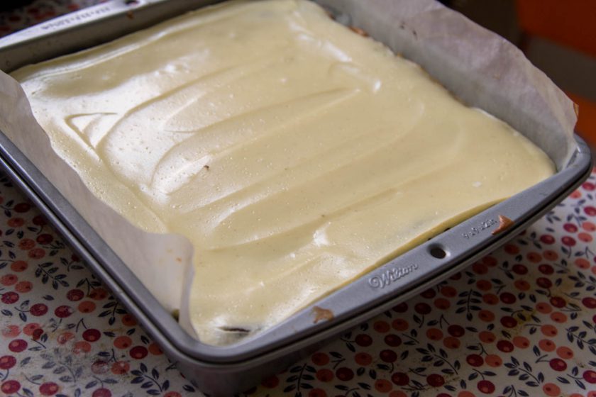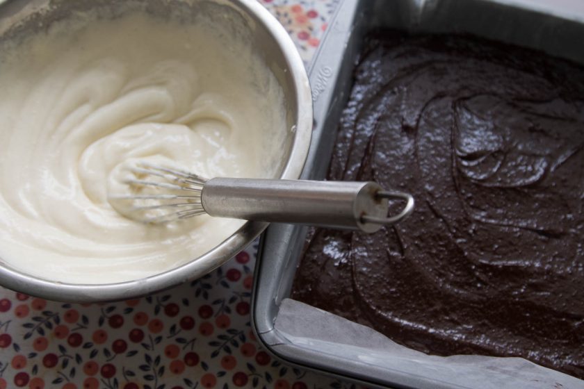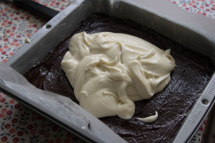 4. לתערובת הגבינה נערבב היטב את חומרי תערובת הגבינה עד שלא נראה גושים – עם כף נפזר את הגבינה בכל פינה מעל שכבת הבראוניז ואז נשטח על הבראוני יפה יפה בעדינות. לא אופים בנפרד את שתי השכבות, אלא יחד!