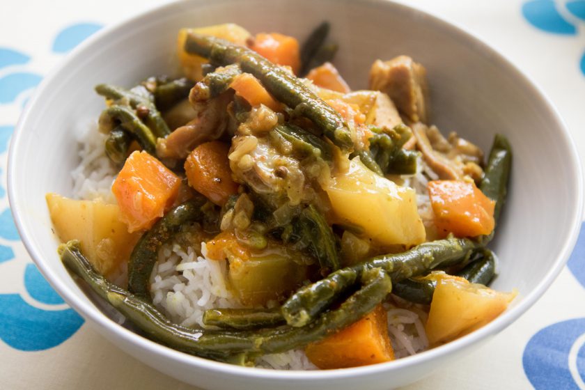3. נוסיף את הבטטות, התפוחי אדמה, האפונה/שעועית נמשיך במלאכת הטיגון עוד 3 דק’, נוסיף קארי, מלח ופלפל שחור