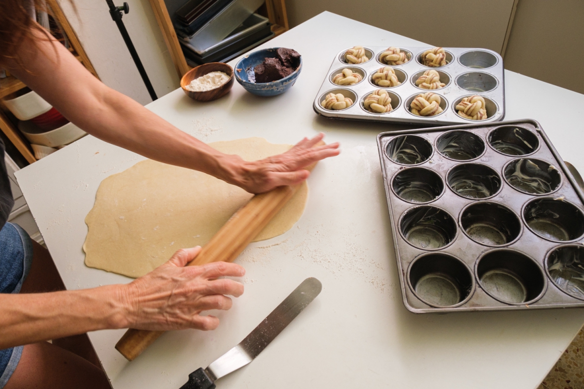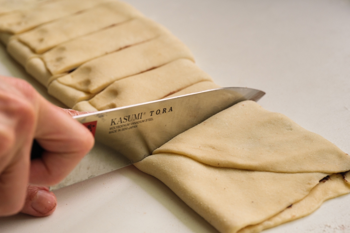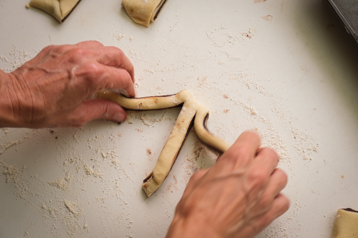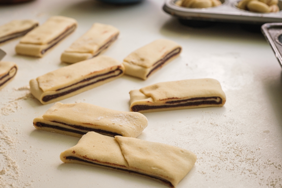 6. עכשיו הכיף: כל מלבן קטן נחתוך לשלוש ונקלע צמה כשהדופן העליונה עדין מחוברת, נגלגל את הצמה לתוך עצמה ונניח בתבנית שקעים משומנת טוב טוב או סתם בתבנית תנור על דף אפייה.