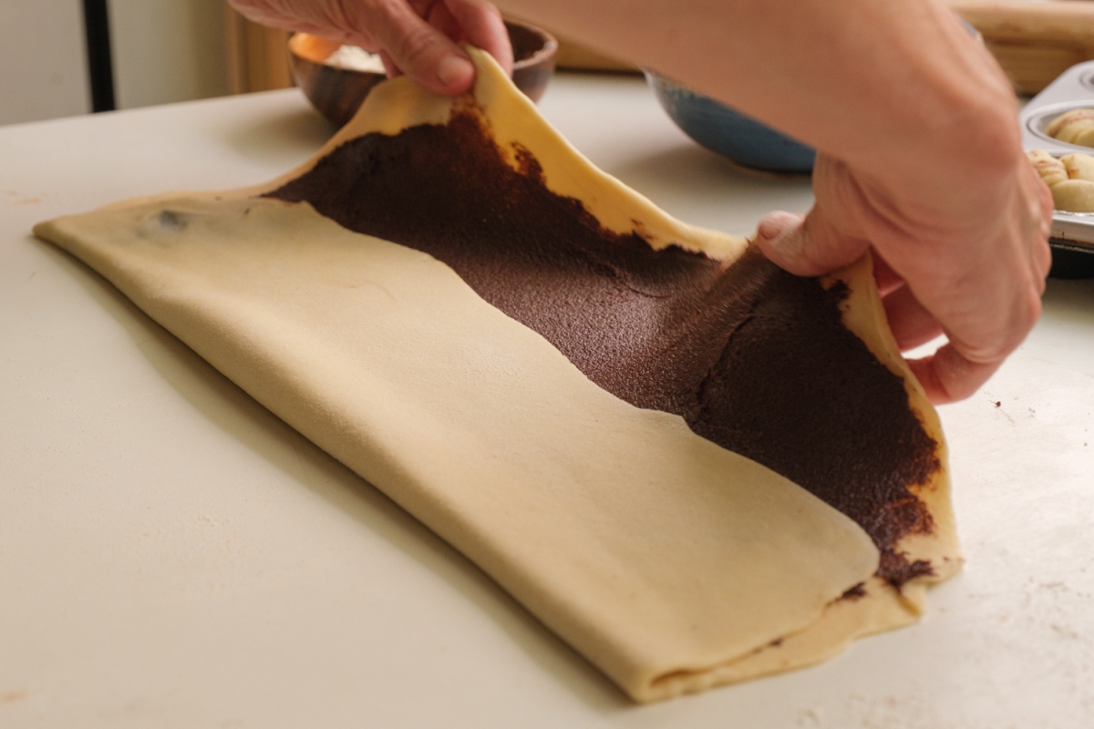 4. נחלק את הבצק לשניים. נפתח כדור אחד למלבן דמיוני, נמרח עליו את מילוי הקינמון, שכבה דקה ויפה לאורך כל המלבן. נקפל כמו בצילום בסיס עד האמצע, נכסה את הקיפול עם הצד השני, נהדק מעט.