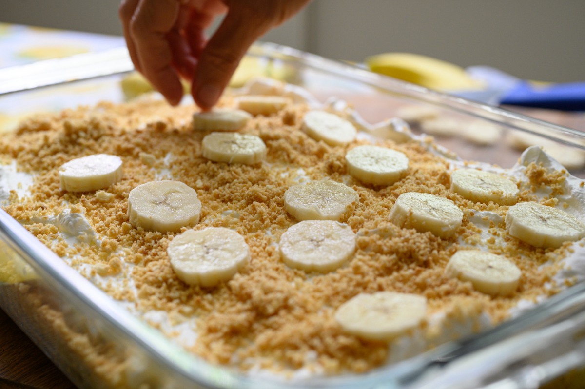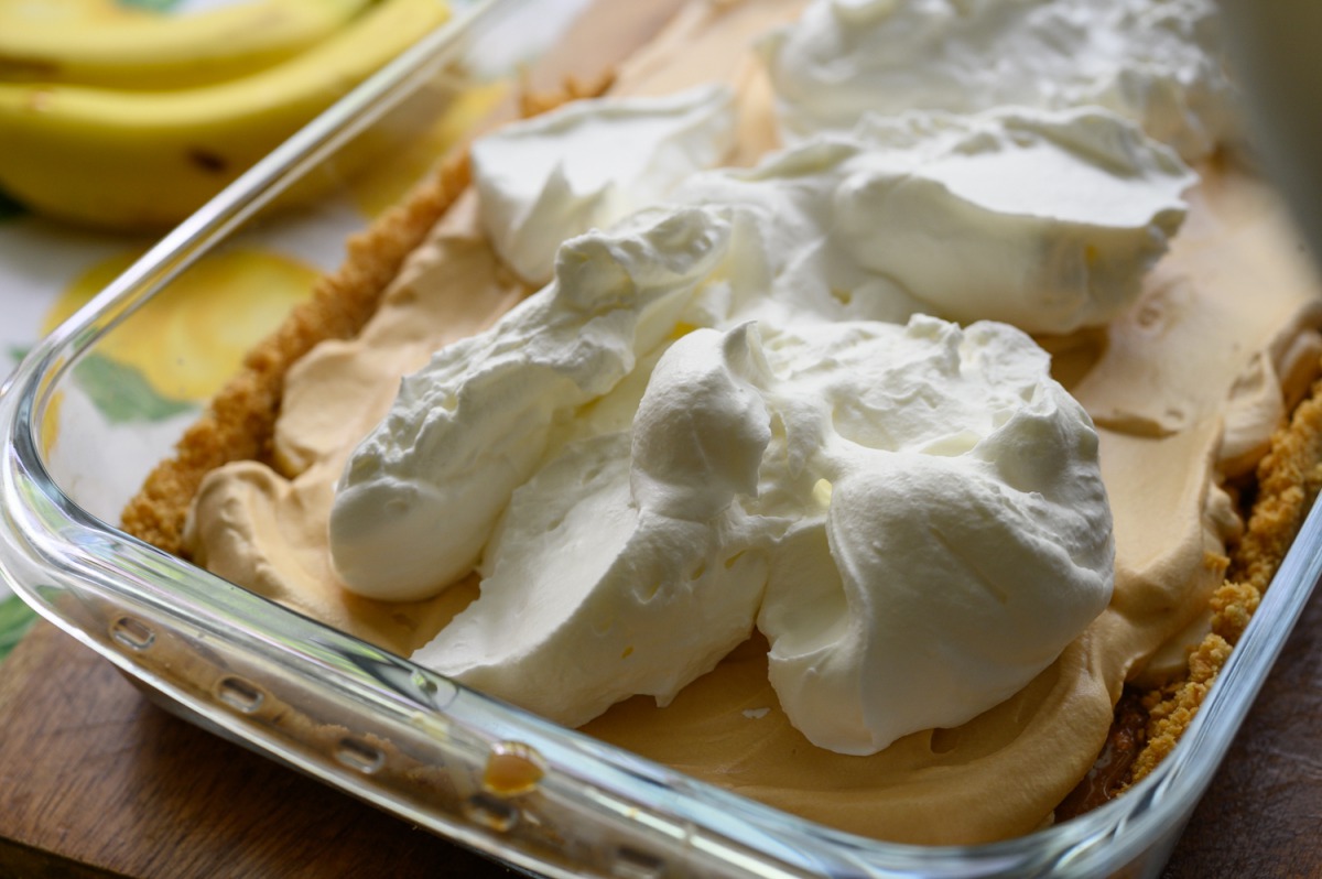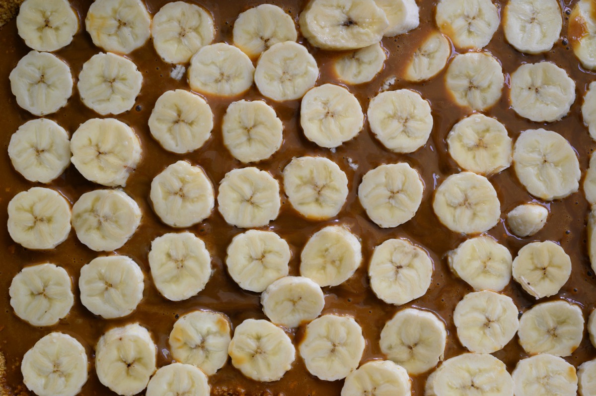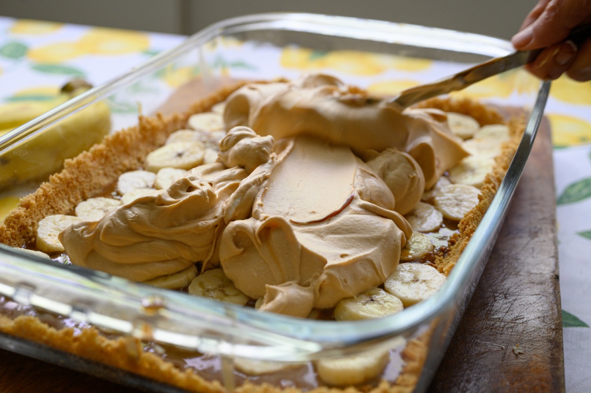 3. הקרם: מקציפים 500 מ”ל שמנת מתוקה עם חצי כוס סוכר, עד קבלת קרם, נחלקו לשניים :לחצי ממנו נוסיף את רבע צנצנת ריבת החלב שנותרה, נערבב היטב ונמרח מעל הבננות ומעל זה את החצי השני של הקצפת הלבנה.