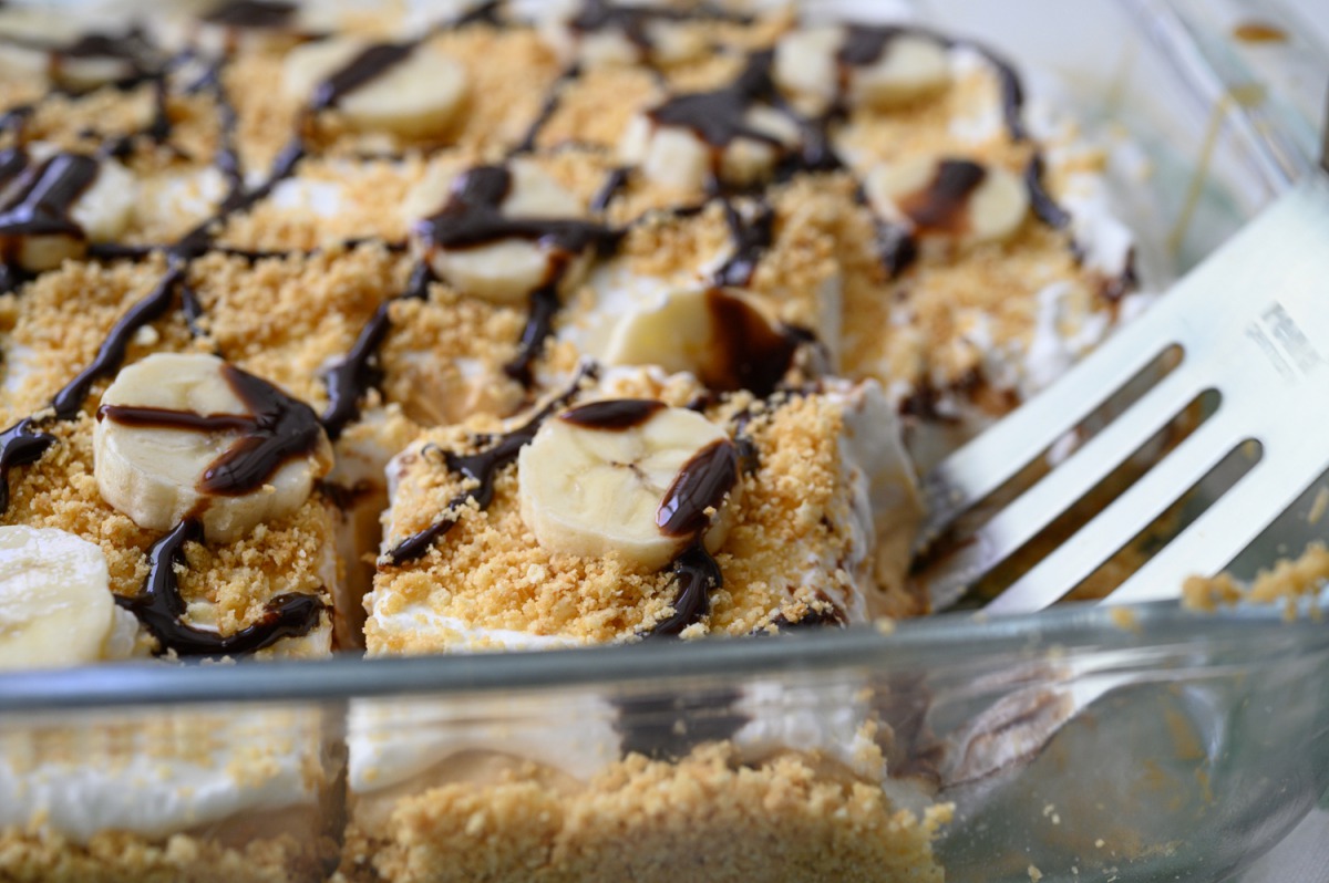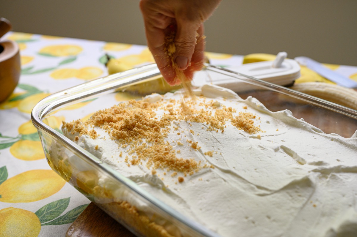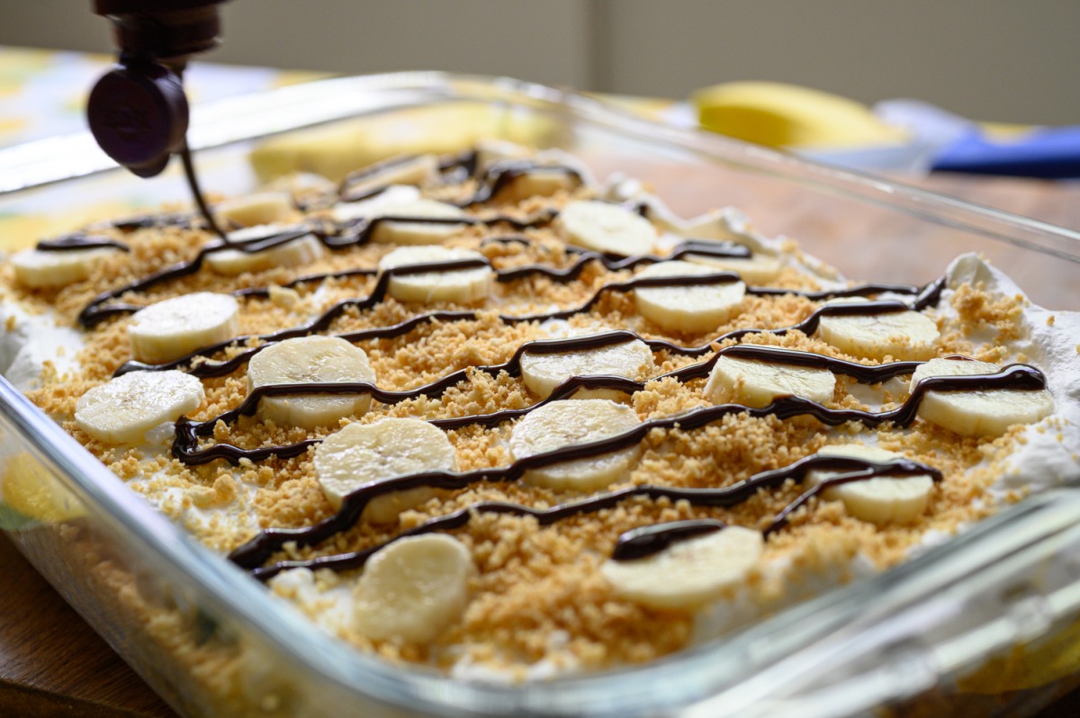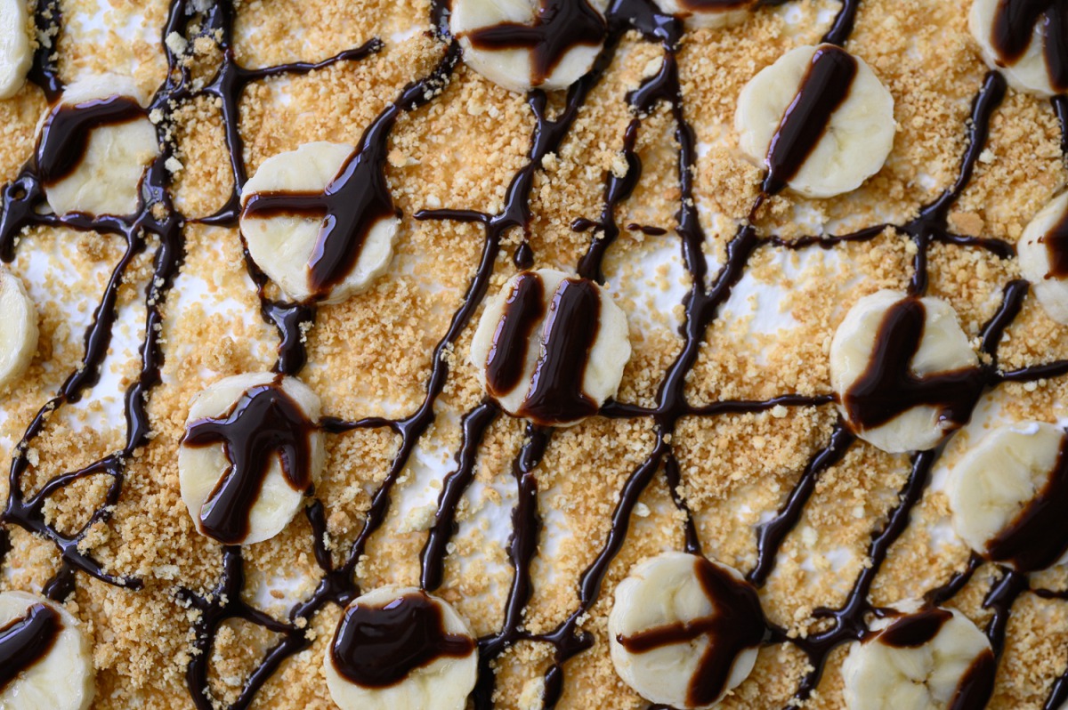 4. נעטר בבננות, בפירורי ביסקוויטים ובסירופ שוקולד. נכסה ונכניס למקרר (אפשר גם להקפאה) איך שאוהבים.