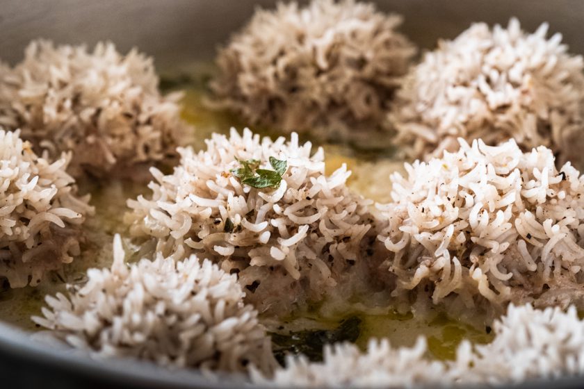 6. נכדרר קציצות יפות ונצפה אותן היטב במעטפת אורז בסמטי, נניח בסיר שלנו קציצה אחרי קציצה. נעטר יפה בעלי נענע או סלרי איפה שיש מקום.